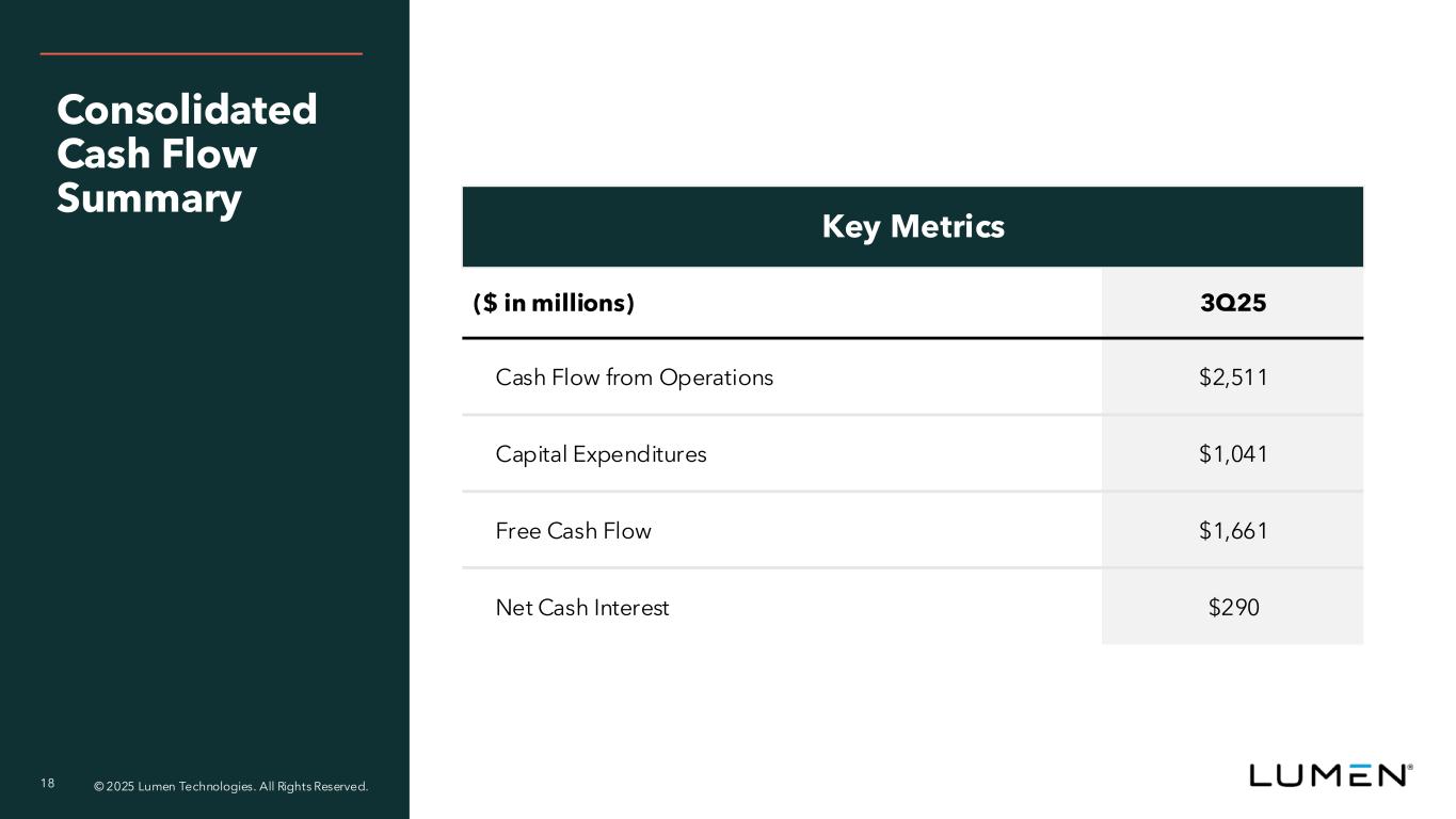 ©2025 Lumen Technologies。版权所有。17 3Q25调整后EBITDA不包括特殊项目(百万美元)3Q25 Y/Y %变化总收入3087美元(4.2%)调整后EBITDA 787美元(12.5%)调整后EBITDA利润率25.5%(240个基点)调整后EBITDA 571美元3Q25特殊项目:(+)遣散费6美元(+)消费者和其他诉讼50美元(+)交易和离职成本(1)79美元(+)现代化和简化(2)73美元(+)其他(3)5美元(+)房地产交易成本(4)3美元调整后EBITDA不包括。特殊项目787美元3Q25 EBITDA特殊项目(百万美元)(1)Transact ion and separation cos ts与(i)Q2 202相关5费用4900万美元f或与自愿放弃我们在FCC农村数字机会基金下收到的Fun Ding相关的费用,(ii)我们最近宣布的计划s ell ou r mass markets fiber-to-th e-home bus in ES,(iii)我们的2022 an d 2023剥离itures,(iv)我们的2024年3月22日债务交易ion支持协议和d我们的9月24日,2024年交换要约和(v)我们对其他潜在t赎回的评估。(2)包括与网络基础设施、产品组合olio、IT系统、旨在在2027年g以ru n率为基础退出的基础上实现10亿美元的nualiz ed成本节约相关的成本。(3)主要包括(i)根据截至2024年3月31日剩余CUS TOMER合同的转让确认2024年第一季度先前在202年10月出售选定CDN合同的递延收益3,以及(ii)在2024年第二季度和2022年第一季度确认某些运营资产的dispos al损失。(4)Real estate tran sactions mainly include th Q4 2 024 real estate holding f or sale的减值损失,扣除我们real es tate rat ionaliz at ion program的相关收益。有关非GAAP指标的定义以及与GAAP数据的对账,请参阅Lumen的投资者关系网站。