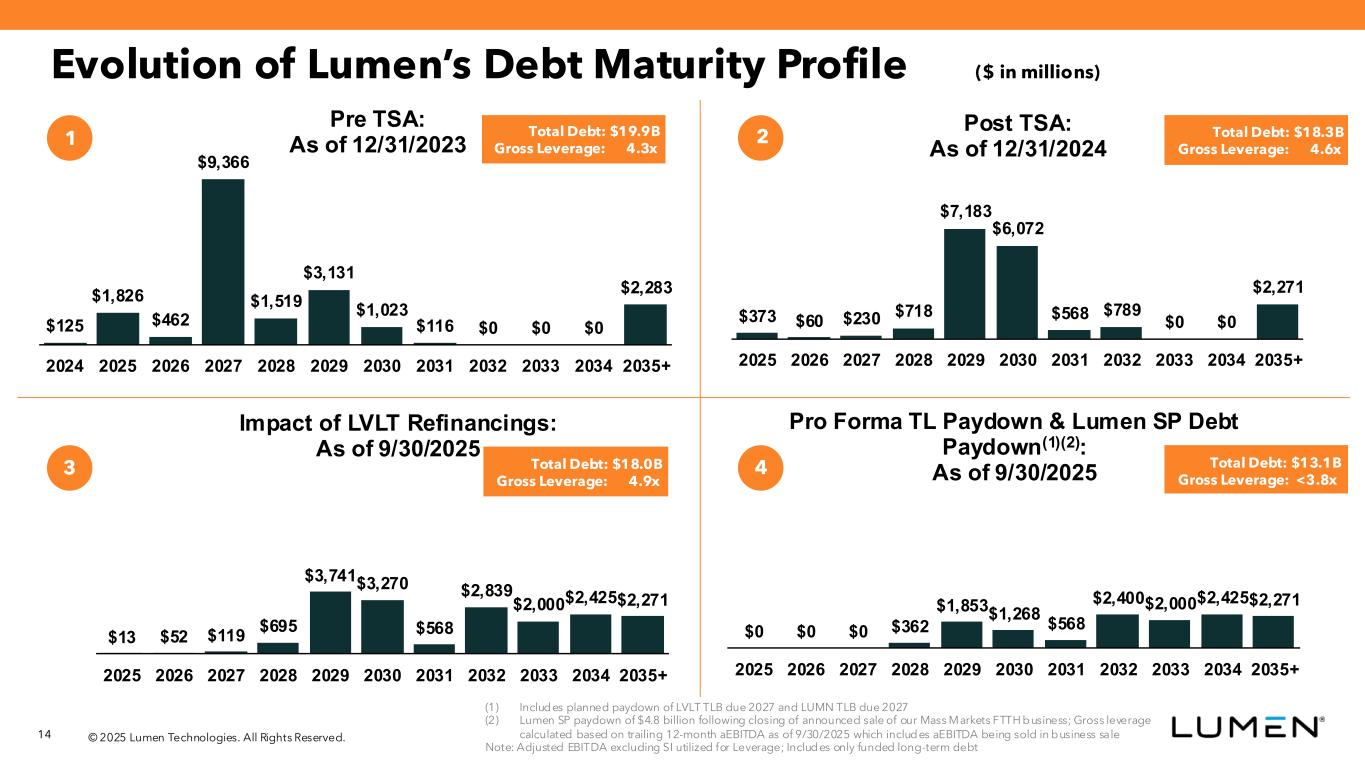 ©2025 Lumen Technologies。版权所有。14 Lumen债务到期情况演变(百万美元)$ 125 $ 1,826 $ 462 $ 9,366 $ 1,519 $ 3,131 $ 1,023 $ 116 $ 0 $ 0 $ 2,2832024202520262027202820292029203020312032203320342035 + Pre TSA:截至12/31/2023总债务:$ 19.9B总杠杆:4.3x 1 $ 373 $ 60 $ 230 $ 718 $ 7,183 $ 6,072 $ 568 $ 789 $ 0 $ 2,27120252026202720282029202920302031203320342035 + Post TSA:截至12/31/2024总债务:$ 18.3B总杠杆:4.6x 2 $ 13 $ 52 $ 119 $ 695 $ 3,LVLT再融资的影响:截至2025年9月30日总债务:$ 18.0b毛杠杆:4.9x 3 $ 0 $ 0 $ 0 $ 362 $ 1,853 $ 1,268 $ 568 $ 2,400 $ 2,000 $ 2,425 $ 2,271202520262027202820292029203020312032203320342035 +备考TL Paydown & Lumen SP债务偿还(1)(2):截至2025年9月30日总债务:$ 13.1b毛杠杆:< 3.8x4(1)包括2027年到期的LVLT TLB的计划偿还和2027年到期的LUMN TLB(2)Lumen SP在宣布出售大众市场FTTH业务完成后偿还48亿美元;毛杠杆根据截至2025年9月30日的过去12个月aEBITDA计算,其中包括在业务出售中出售的aEBITDA注:调整后的EBITDA不包括用于杠杆的SI;仅包括融资的长期债务