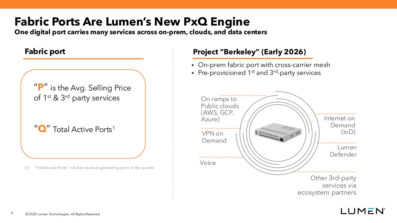 ©2025 Lumen Technologies。版权所有。9个Fabric端口是Lumen的新PXQ引擎One数字端口在向公有云(AWS、GCP、Azure)的坡道上承载许多跨本地、云和数据中心的服务VPN on demand Lumen Defender其他第三方服务,通过生态系统合作伙伴Internet on demand(IoD)语音项目“Berkeley”(2026年初)•带有跨载波网格的本地Fabric端口•预先提供的第1和第3方服务Fabric端口“Q”总活跃端口1“P”为平均。1st & 3rd party services selling price(1)“total active ports”= active revenue generating ports in the quarter