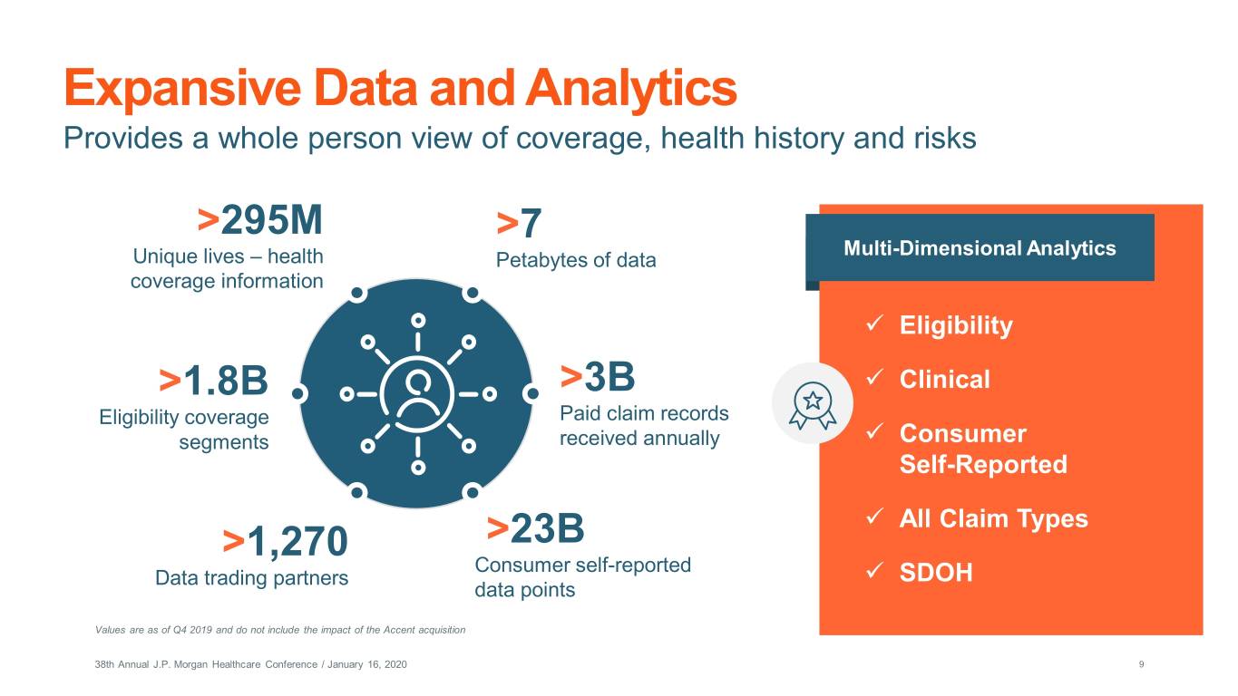 可扩展的数据和分析提供了覆盖的整体视图,健康历史与风险>2.95M>7多维分析独特的生命-健康千万亿字节数据覆盖信息合格>1.8B>3B临床合格覆盖付费的索赔记录片段每年收到消费者自我报告>23B所有索赔类型>1,270个消费者自我报告数据交易伙伴SDOH数据点值截至2019年Q4和不包括口音收购第38届J.P.Morgan医疗保健年会/1月16日的影响,20209年
