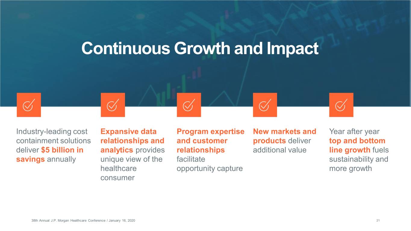 持续增长和影响行业领先的成本膨胀数据程序专业知识新的市场和年复一年的遏制解决方案关系和客户产品交付的顶部和底部交付的50亿美元分析提供了关系额外的价值线增长燃料节约每年独特的观点,促进可持续发展和医疗保健机会捕捉更多增长消费者第38届摩根大通医疗保健年会/1月16日,202021年