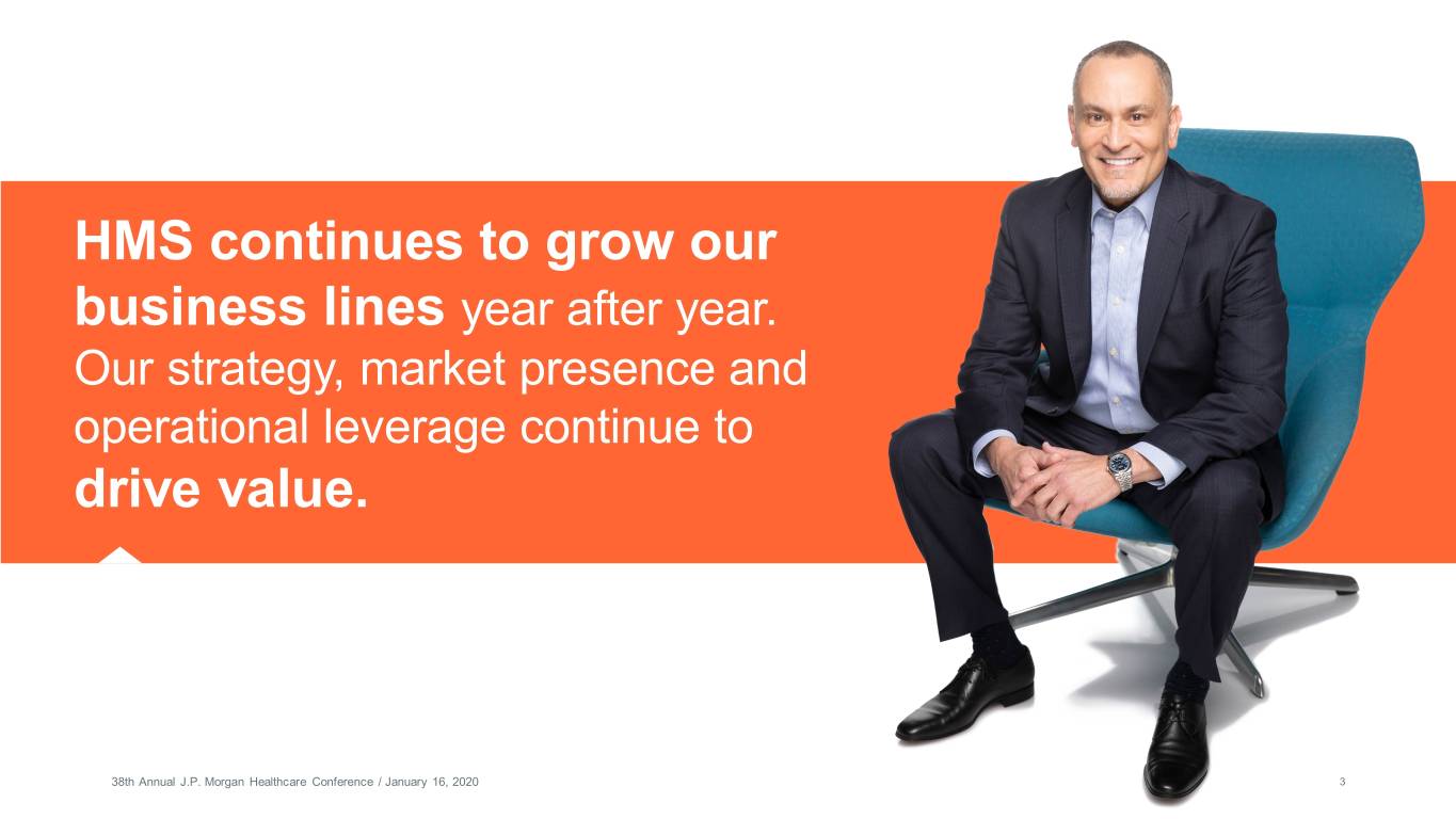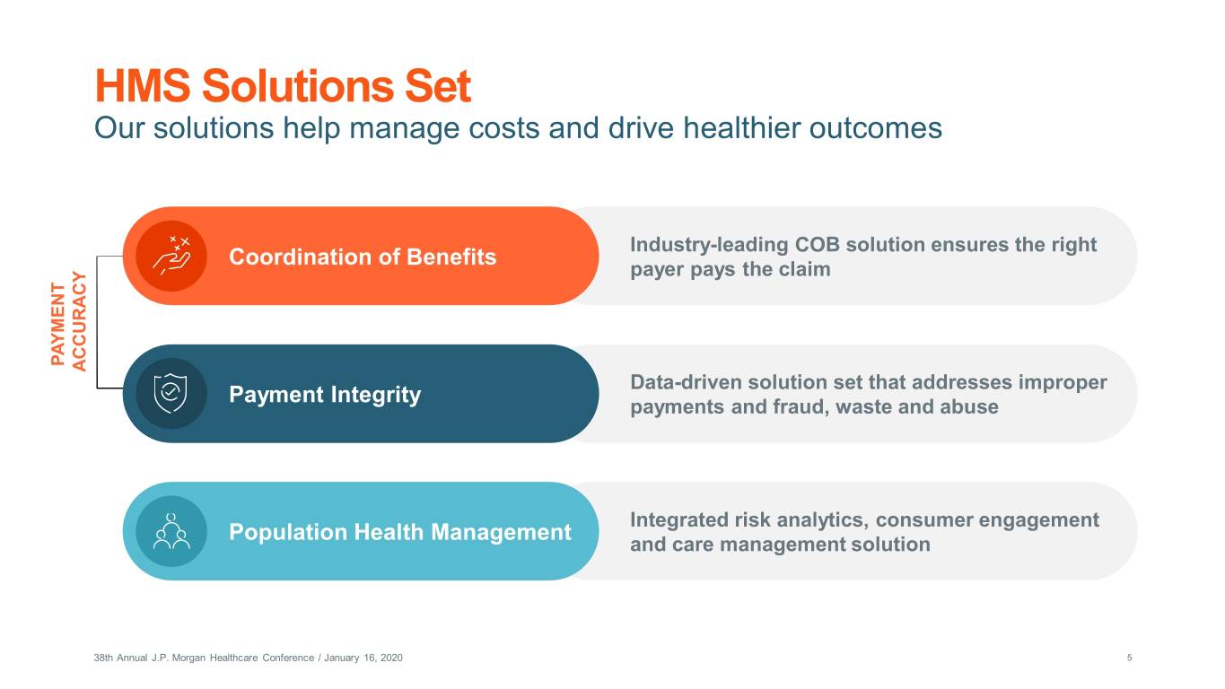 HMS解决方案集我们的解决方案帮助管理成本和驱动更健康的结果行业领先的COB解决方案确保利益支付者支付索赔的正确协调支付准确性数据驱动解决方案集,解决不当支付完整性支付和欺诈、浪费和滥用综合风险分析,消费者参与人口健康管理和护理管理解决方案第38届J.P.Morgan医疗保健年会/2020年1月16日
