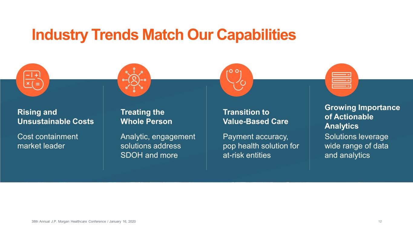行业趋势与我们的能力相匹配日益重要的上升和治疗向可操作的、不可持续的成本过渡的整个人基于价值的护理分析的成本控制分析,支付的准确性,解决方案利用市场领导者解决方案解决方案针对广泛的数据SDOH和更多的风险实体的流行健康解决方案和分析第38届J.P.Morgan医疗保健年会/2012年1月16日
