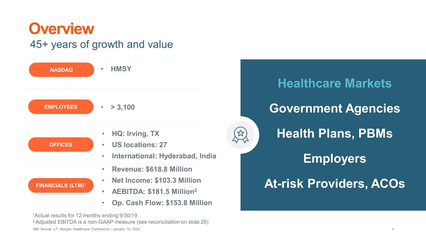 概述45+年的增长和价值纳斯达克HMSY医疗保健市场公司雇员>3100家政府机构总部:Irving,TX Health Plans,PBMS Office US Locations:27International:Hyderabad,India Employers Revenue:6.188亿美元净收入:1.033亿美元Financial(LTM)1风险提供者,Acos Aebitda:1.815亿美元。现金流:截至9/30/192调整后EBITDA的12个月实际业绩:1.538亿美元1非GAAP衡量(见幻灯片26上的对账)第38届摩根大通医疗保健年会/2020年1月16日