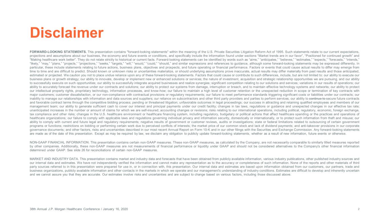 免责声明前瞻性陈述。这份陈述包含了1995年《美国私人证券诉讼改革法》所指的"前瞻性陈述" 。这些陈述与我们目前对我们的业务、经济和未来事件或状况的预期、预测和假设有关,特别包括在"市场趋势有利于我们" 、 "适合持续增长"和"使医疗保健工作更好"等章节中找到的信息。它们与历史或当前事实没有严格的联系。前瞻性陈述可以用"目标" 、 "预期" 、 "相信" 、 "预期" 、 "预期" 、 "预测" 、 "打算" 、 "可能" 、 "可能" 、 "计划" 、 "项目" 、 "预测" 、 "寻找" 、 "目标" 、 "意愿" 、 "意愿" 、 "可能" 、 "应该"以及类似的表述和对指导的引用来确定,尽管一些前瞻性陈述可以用不同的方式表述。特别是,其中包括与未来行动、业务计划、目标和前景以及未来经营或财务业绩有关的报表。可能导致实际结果不同的因素或事件可能不时出现,难以预测。如果已知或未知的风险或不确定因素出现,或基础假设证明不准确,实际结果可能与过去的结果以及预期、估计或预测的结果有重大差异。我们告诫你不要过分依赖这些前瞻性陈述。可能造成或促成这种差异的因素包括但不限于:我们执行业务计划或增长战略的能力;我们创新、开发或实施新的或增强的解决方案或服务的能力;我们所追求的投资、收购和战略关系机会的性质我们有能力成功地利用这些机会;我们有能力成功地整合已取得的业务并实现协同增效;与我们的解决方案和服务有关的重大竞争;我们的运营结果各不相同;我们有能力准确地预测我们的合同和解决方案下的收入;我们有能力保护我们的系统受到破坏,中断或破坏,并维护有效的技术系统和网络;我们保护知识产权、专有技术、信息处理的能力,和专有技术;我们未能保持高水平的客户保留或意外减少或终止与主要客户的关键合同;客户的不满,或我们不遵守合同规定或监管要求;我们没有达到履约标准,导致我们的合同下的重大成本或负债;我们无法管理我们与信息和数据来源及供应商的关系;我们依赖分包商和其他第三方供应商及当事方提供服务;我们有能力通过竞标程序继续确保未来的合同和有利的合同条款;未决或有威胁的诉讼;在法律诉讼中不利的结果;我们成功地吸引和留住合格的雇员和管理团队成员;我们有能力产生足够的现金来支付我们的利息。根据我们的信贷机制支付的本金;税法的变化,条例或指引及有效税率的意外变动;我们自保的申索数目或金额的意外增加;会计变动或修订;与我们的国际业务有关的风险,包括政治、监管、经济、外汇,税收合规和其他风险;美国医疗卫生环境或医疗卫生融资体系的变化,包括影响医疗卫生支出或医疗卫生组织做法和运作的监管、预算或政治行动;我们没有遵守有关个人隐私和信息安全的适用法律和法规,在国内或国际上,或为了保护这些信息不被窃取和滥用;我们遵守当前和未来法律和监管要求的能力;政府或客户审查的负面结果,审计或调查;与外包某些政府方案或职能有关的州或联邦限制;由于察觉到利益冲突而限制投标或执行某些工作;我们的普通股市场价格和缺乏股息支付;以及公司治理文件中的反接管规定;以及其他因素,我们最近一份关于Form10-K的年度报告和我们提交证券交易委员会的其他文件中描述了风险和不确定性。任何前瞻性陈述均在本陈述之日作出。除法律另有规定外,我们不承担任何公开更新前瞻性陈述的义务,无论是由于新的信息、未来事件还是其他原因。非GAAP财务信息。本说明包含某些非GAAP措施。这些非GAAP衡量标准,如公司计算的,不一定与其他公司报告的类似标题的衡量标准相当。此外,这些非GAAP衡量标准不是GAAP下财务业绩或流动性的衡量标准,不应被认为是公司在GAAP下确定的其他财务信息的替代。关于某些非GAAP措施的对账,请参见幻灯片26。市场和行业数据。这份报告载有从公开资料、各种行业出版物、其他已公布的行业来源以及我们的内部数据和估计中获得的市场和行业数据和预测。我们没有对这些信息进行独立的验证,也不能对这些信息的准确性或完整性作出任何表示。本说明中提到的第三方来源的报告和其他材料均未准备用于或与本说明有关。我们的内部数据和估计数是根据从我们的客户、合作伙伴、贸易和商业组织获得的信息、在我们经营的市场上可公开获得的信息和其他联系以及我们的管理层对行业状况的了解而得出的。估计数很难发展,而且固有地不确定,我们不能向你保证它们是准确的。我们的估计数涉及风险和不确定因素,并将根据各种因素,包括上文讨论的因素加以改变。第38届摩根大通医疗保健年会/2020年1月16日