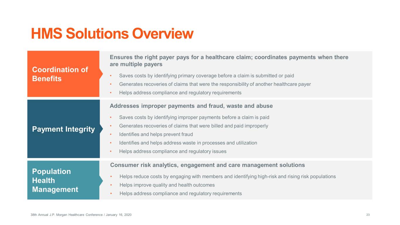 HMS解决方案概述确保正确的付款人为医疗保健索赔支付费用;当有多个付款人协调支付费用时,通过在提交索赔或支付福利之前确定主要的保险范围来协调支付费用监管要求涉及不当付款和欺诈行为,废物和滥用通过在支付索赔之前识别不当付款来节省成本,从而产生索赔的追回,这些索赔被帐单和支付不当付款的完整性识别,并有助于防止欺诈识别和帮助处理过程中的废物和利用,有助于解决消费者风险分析的合规性和监管问题,参与和护理管理解决方案人口通过与成员接触和确定高风险和不断上升的风险人口有助于降低成本,健康有助于提高质量和健康成果管理有助于满足合规和监管要求,第38届摩根大通医疗保健年会/2023年1月16日
