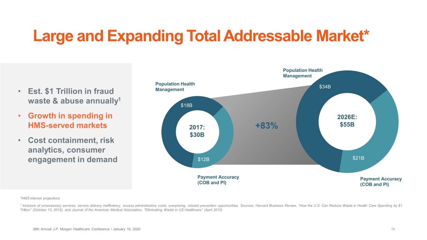 *人口健康管理人口健康$34B EST$1万亿欺诈管理1废物及滥用每年$18B开支增长2026E:HMS服务的市场2017+83%$55B$30B成本控制,风险分析,消费者参与需求$12B$21B支付准确性(COB和PI) (COB和PI) *HMS内部预测1包括不必要的服务、服务交付效率低、行政成本过高、定价过高、错过预防机会。资料来源:哈佛商业评论(2015年10月13日)和美国医学会杂志(2012年4月)第38届J.P.Morgan医疗保健年会/2013年1月16日