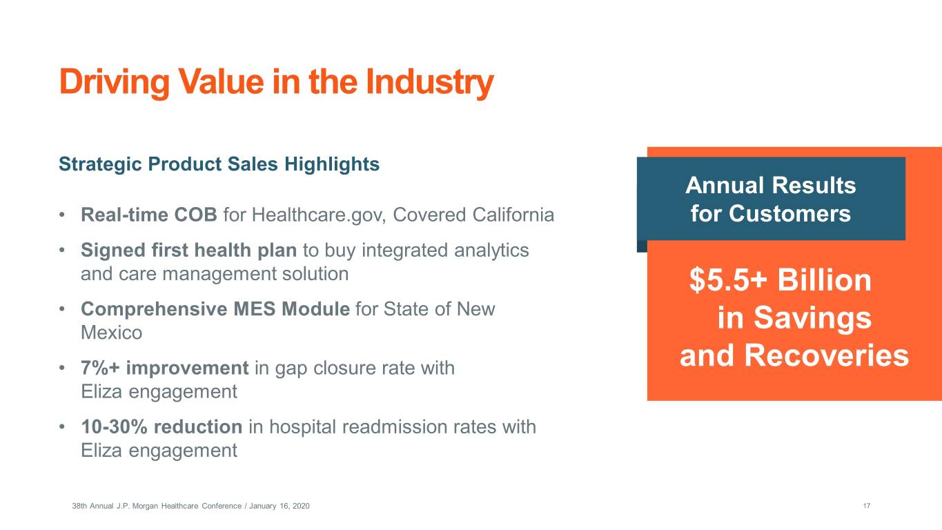 推动价值在行业战略产品销售突出年度业绩实时COB for Healthcare.gov,覆盖加利福尼亚州的客户签署了第一个健康计划,为新墨西哥州购买55亿美元的综合分析和护理管理解决方案,节省7% +的缺口封堵率的改善,并收回伊莱扎的承诺,医院复诊率每年减少10-30% ,伊莱扎的承诺每年减少10-30%摩根大通医疗保健会议/1月16日,202017