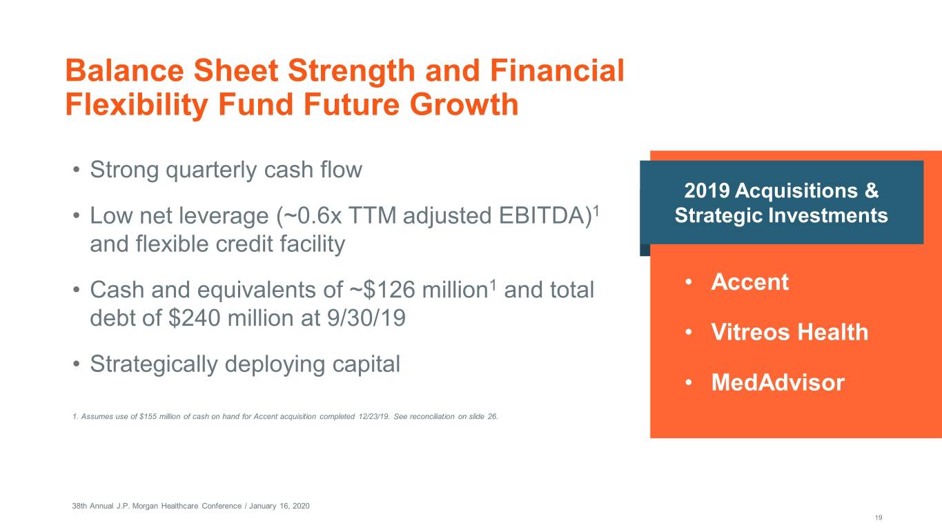 资产负债表实力和财务灵活性基金未来增长强劲的季度现金流2019年收购&低净杠杆( ~0.6倍TTM调整后EBITDA)1战略投资和灵活信贷融资现金及等价物为-1.26亿美元1,总重音债务为2.4亿美元,AT9/30/19Vitreos Health战略部署资本MedAdvisors1。假设手头现金1.55亿美元用于完成12/23/19年度的重音收购。参见幻灯片26中的对账。第38届摩根大通医疗保健年会/2019年1月16日