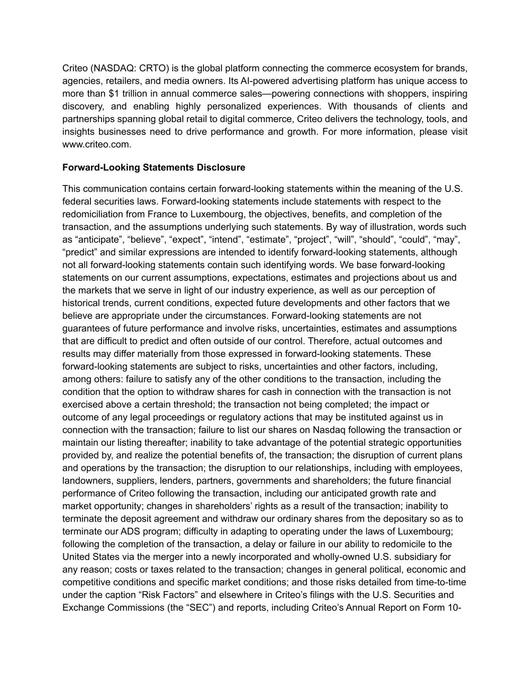 Criteo(NASDAQ:CRTO)是连接品牌商、代理商、零售商和媒体所有者的商业生态系统的全球平台。其人工智能驱动的广告平台可以独特地获得超过1万亿美元的年商业销售额——为与购物者的联系提供动力,激发发现,并实现高度个性化的体验。凭借从全球零售到数字商务的数千家客户和合作伙伴关系,Criteo提供了企业推动业绩和增长所需的技术、工具和洞察力。欲了解更多信息,请访问www.criteo.com。前瞻性陈述披露本通讯包含美国联邦证券法含义内的某些前瞻性陈述。前瞻性陈述包括有关从法国迁至卢森堡的陈述、交易的目标、收益和完成,以及这些陈述背后的假设。举例说明,“预期”、“相信”、“预期”、“打算”、“估计”、“项目”、“将”、“应该”、“可以”、“可能”、“预测”等词语和类似表述旨在识别前瞻性陈述,尽管并非所有前瞻性陈述都包含此类识别词语。我们的前瞻性陈述基于我们当前对我们和我们所服务的市场的假设、预期、估计和预测,并根据我们的行业经验,以及我们对历史趋势、当前状况、预期未来发展和我们认为在当时情况下适当的其他因素的看法。前瞻性陈述并非对未来业绩的保证,涉及难以预测且通常超出我们控制范围的风险、不确定性、估计和假设。因此,实际结果和结果可能与前瞻性陈述中表达的内容存在重大差异。这些前瞻性陈述受到风险、不确定性和其他因素的影响,其中包括:未能满足交易的任何其他条件,包括与交易有关的股份提取现金选择权未在一定门槛以上行使的条件;交易未完成;可能就交易对我们提起的任何法律诉讼或监管行动的影响或结果;未能在交易后在纳斯达克上市或此后维持我们的上市;无法利用交易提供的潜在战略机会并实现交易的潜在利益;交易扰乱了当前的计划和运营;破坏了我们之间的关系,包括与员工、土地所有者、供应商、贷方、合作伙伴、政府和股东;交易后Criteo未来的财务表现,包括我们预期的增长率和市场机会;交易导致股东权利发生变化;无法终止存款协议并从存托人那里提取我们的普通股以终止我们的ADS计划;难以适应根据卢森堡法律运营;交易完成后,由于任何原因,我们无法通过合并为新注册成立的全资美国子公司而重新定居美国;与交易相关的成本或税收;一般政治、经济和竞争条件以及特定市场条件的变化;以及在“风险因素”标题下以及在Criteo向美国证券交易委员会(“SEC”)提交的文件和报告中不时详述的那些风险,包括Criteo在表格10-上的年度报告