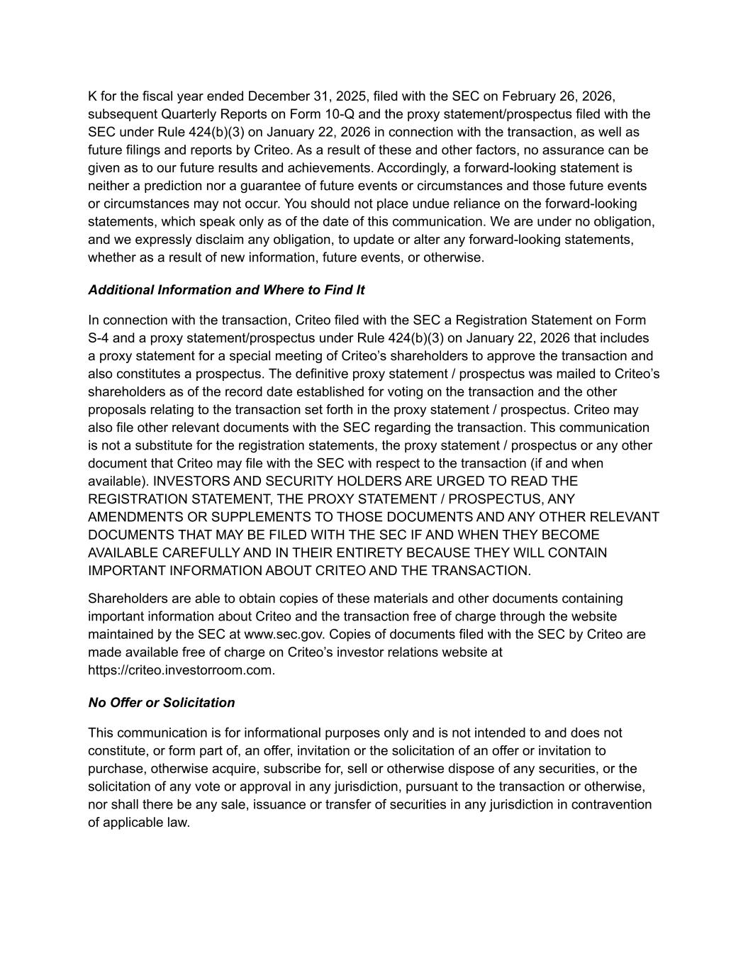 K为截至2025年12月31日的财政年度,于2026年2月26日向SEC提交,随后于2026年1月22日根据规则424(b)(3)向SEC提交的与交易有关的10-Q表格季度报告和代理声明/招股说明书,以及Criteo未来的文件和报告。由于这些因素和其他因素,不能对我们未来的成果和成就作出任何保证。因此,前瞻性陈述既不是对未来事件或情况的预测,也不是对未来事件或情况的保证,这些未来事件或情况可能不会发生。您不应过分依赖前瞻性陈述,这些陈述仅在本通讯发布之日起生效。我们没有义务,而且我们明确表示不承担任何义务,更新或更改任何前瞻性陈述,无论是由于新信息、未来事件或其他原因。附加信息以及在哪里可以找到与交易相关的信息,Criteo于2026年1月22日根据规则424(b)(3)向SEC提交了一份S-4表格的注册声明和一份委托书/招股说明书,其中包括一份提交给Criteo股东特别会议以批准交易的委托书,也构成招股说明书。最终的委托书/招股说明书已邮寄给截至为就该交易以及委托书/招股说明书中所载的与该交易有关的其他提案进行投票而确定的登记日的Criteo股东。Criteo还可能就该交易向SEC提交其他相关文件。本通讯不能替代注册声明、代理声明/招股说明书或Criteo可能就交易向SEC提交的任何其他文件(如果可用)。请投资者和证券持有人仔细完整地阅读登记声明、代理声明/招股说明书、这些文件的任何修订或补充以及可能提交给SEC的任何其他相关文件,因为这些文件将包含有关CRITEO和交易的重要信息。股东可以通过SEC维护的网站www.sec.gov免费获得这些材料以及包含有关Criteo和交易的重要信息的其他文件的副本。Criteo向SEC提交的文件副本可在Criteo的投资者关系网站https://criteo.investorroom.com上免费查阅。任何要约或招揽本通讯仅供参考,并非旨在也不构成或构成要约、邀请或招揽要约或邀请的一部分,以购买、以其他方式收购、认购、出售或以其他方式处置任何证券,或根据交易或其他方式在任何司法管辖区招揽任何投票或批准,也不得在任何司法管辖区违反适用法律出售、发行或转让证券。