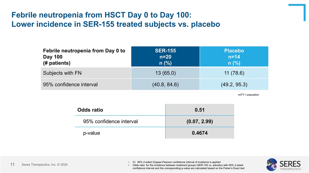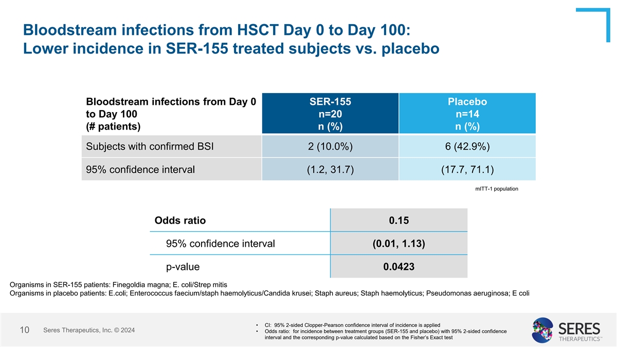 HSCT第0天至第100天的血流感染:SER-155治疗受试者的发病率低于安慰剂从第0天SER-155安慰剂到第100天的血流感染n = 20 n = 14(#患者)n(%)n(%)BSI2确诊受试者(10.0%)6(42.9%)95%置信区间(1.2,31.7)(17.7,71.1)mITT-1人群优势比0.1595%置信区间(0.01,1.13)SER-155患者中p值0.04 23生物体:大非高丽菌;安慰剂患者中的大肠杆菌/Strep mitis生物体:大肠杆菌;粪肠球菌/溶血性葡萄球菌/克鲁塞念珠菌;金黄色葡萄球菌;溶血性葡萄球菌;铜绿假单胞菌;大肠杆菌• CI:应用95% 2面Clopper-Pearson发病率置信区间,赛里斯治疗公司 © 202410 •优势比:用于治疗组(SER-155和安慰剂)之间的发病率,95% 2面置信区间和基于Fisher精确检验计算的相应p值
