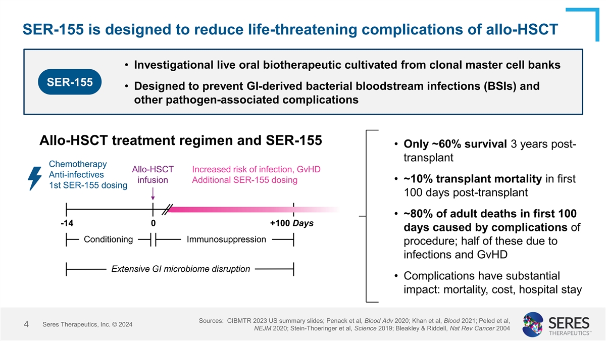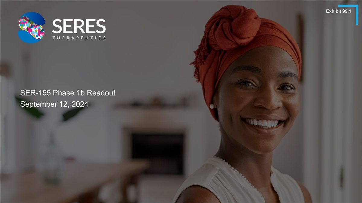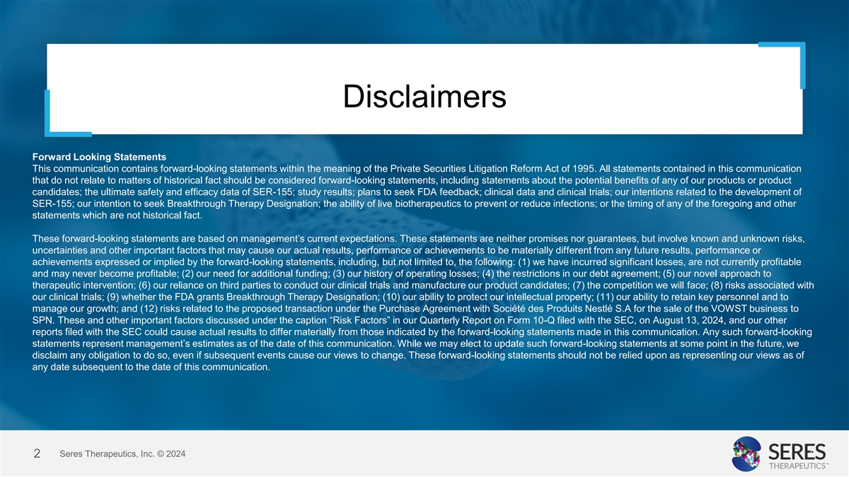 免责声明前瞻性陈述本通讯包含1995年《私人证券诉讼改革法案》含义内的前瞻性陈述。本通讯中包含的与历史事实无关的所有陈述应被视为前瞻性陈述,包括关于我们的任何产品或候选产品的潜在益处的陈述;SER-155的最终安全性和有效性数据;研究结果;寻求FDA反馈的计划;临床数据和临床试验;我们与SER-155开发相关的意图;我们寻求突破性治疗指定的意图;活体生物治疗药物预防或减少感染的能力;或上述任何陈述的时间安排以及其他非历史事实的陈述。这些前瞻性陈述是基于管理层目前的预期。这些陈述既不是承诺也不是保证,而是涉及已知和未知的风险、不确定性和其他可能导致我们的实际结果、业绩或成就与前瞻性陈述中明示或暗示的任何未来结果、业绩或成就存在重大差异的重要因素,包括但不限于:(1)我们蒙受了重大损失,目前没有盈利,可能永远不会盈利;(2)我们对额外资金的需求;(3)我们的经营亏损历史;(4)我们的债务协议中的限制;(5)我们对治疗干预的新颖方法;(6)我们依赖第三方来进行我们的临床试验和制造我们的候选产品;(7)我们将面临的竞争;(8)与我们的临床试验相关的风险;(9)FDA是否授予突破性疗法指定;(10)我们保护我们知识产权的能力;(11)我们留住关键人员和管理我们的增长的能力;及(12)与Soci é t é des Produits Nestl é S.A就向SPN出售VOWST业务的购买协议项下拟议交易相关的风险。我们于2024年8月13日向SEC提交的10-Q表格季度报告中“风险因素”标题下讨论的这些和其他重要因素,以及我们向SEC提交的其他报告,可能会导致实际结果与本通讯中的前瞻性陈述所表明的结果存在重大差异。任何此类前瞻性陈述均代表管理层截至本通讯发布之日的估计。虽然我们可能会选择在未来某个时候更新此类前瞻性陈述,但我们不承担这样做的任何义务,即使后续事件导致我们的观点发生变化。这些前瞻性陈述不应被视为代表我们在本通讯日期之后的任何日期的观点。赛里斯治疗公司 © 202422