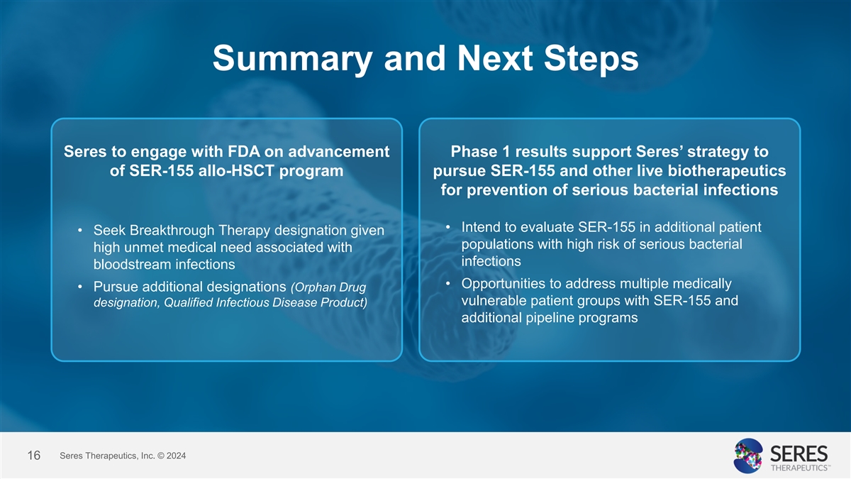 摘要和下一步Seres与FDA就推进1期结果进行接触支持Seres的SER-155 allo-HSCT计划战略追求SER-155和其他活体生物治疗药物以预防严重细菌感染•打算在额外的患者中评估SER-155 •考虑到与感染血流感染相关的严重细菌高风险未满足的医疗需求的人群,寻求突破性治疗指定•解决多种医学问题的机会•寻求额外指定(具有SER-155和指定的孤儿药脆弱患者群体,合格的传染病产品)额外管道计划赛里斯治疗公司 © 202416