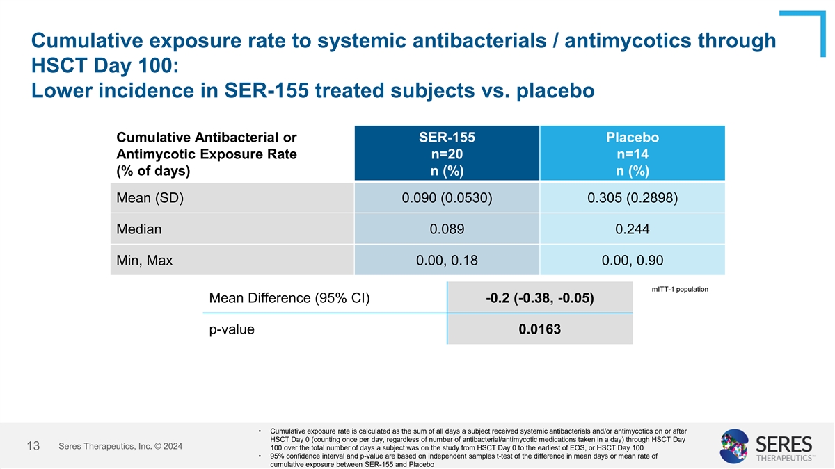 通过HSCT第100天累计暴露于全身性抗菌药物/抗菌药物:SER-155治疗受试者与安慰剂相比发生率更低累计抗菌或SER-155安慰剂抗菌暴露n = 20 n = 14(HSCT天数)n(%)n(%)均值(SD)9.2(5.44)21.1(20.31)中值9.01 4.0 min,最大值0,190,74 mITT-1人群均值差(95% CI)-11.9(-23.85,-0.04)p值0.04 94 •累计暴露是受试者在HSCT第0天至第100天期间接受全身性抗菌药物和/或抗菌药物的所有天数的总和;每天计数一次,无论服用了多少种药物赛里斯治疗,Inc. © 202412 •基于独立样本的95%置信区间和p值SER-155与安慰剂平均天数差异的t检验