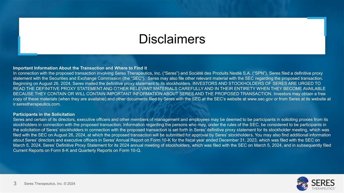 免责声明关于此次交易的重要信息以及在哪里可以找到与涉及赛里斯治疗公司(“Seres”)和Soci é t é des Produits Nestl é S.A.(“SPN”)的拟议交易有关的信息,Seres向美国证券交易委员会(“SEC”)提交了最终代理声明。Seres还可能就拟议交易向SEC提交其他相关材料。从2024年8月26日开始,Seres向其股东邮寄了最终的代理声明。请投资者和Seres的股东在可获得最终代理声明和其他相关材料时仔细并完整地阅读它们,因为它们包含或将包含有关Seres和拟议交易的重要信息。投资者可以在SEC网站www.sec.gov或在Seres网站ir.seretherapeutics.com上免费获得Seres向SEC提交的这些材料(如果有)和其他文件的副本。征集的参与者Seres及其某些董事、执行官和其他管理层成员及雇员可被视为就拟议交易向其股东征集代理的参与者。根据SEC的规则,可能被视为与拟议交易有关的Seres股东征集参与者的相关信息载于Seres于2024年8月26日向SEC提交的股东大会最终代理声明中,提议的交易将提交给Seres的股东批准。您还可以在Seres于2024年3月5日向SEC提交的截至2023年12月31日的财政年度的10-K表格年度报告中找到有关Seres董事和执行官的更多信息,Seres于2024年3月5日向SEC提交的2024年年度股东大会的最终代理声明,以及随后提交的8-K表格当前报告和10-Q表格季度报告中的最终代理声明。赛里斯治疗公司 © 202433