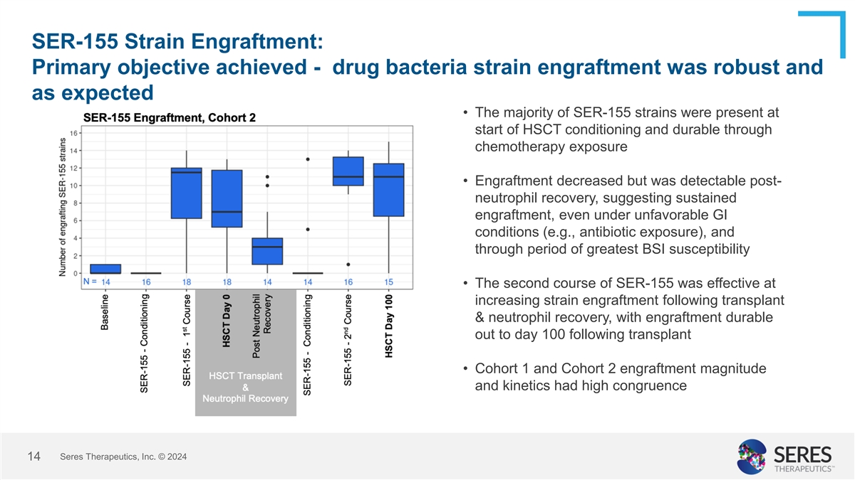 SER-155毒株植入:实现了主要目标-药物细菌菌株植入稳健且符合预期•大多数SER-155毒株在HSCT调理开始时就存在,并通过化疗暴露而持久•植入减少,但在中性粒细胞恢复后可检测到,这表明即使在不利的GI条件下(例如抗生素暴露)也可持续植入,并在BSI最大易感期度过• SER-155的第二个疗程在移植后增加毒株植入&中性粒细胞恢复方面有效,移植后可持续植入至第100天•队列1和队列2的植入幅度和动力学具有高一致性赛里斯治疗公司 © 202414