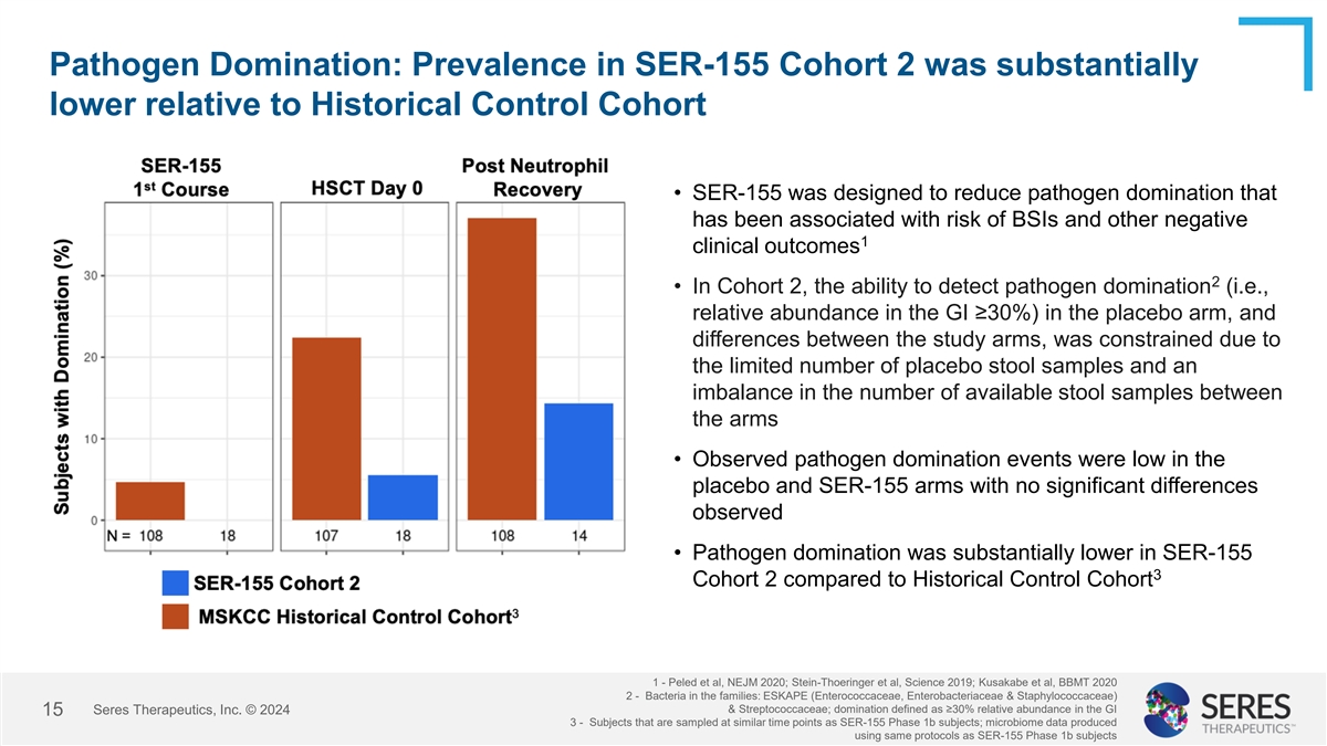 病原体支配:相对于历史对照队列,SER-155队列2的流行率显着降低• SER-155旨在降低与BSI风险和其他阴性1临床结果相关的病原体支配2 •在队列2中,检测安慰剂组病原体支配(即GI中的相对丰度≥ 30%)的能力,以及研究组之间的差异,由于安慰剂粪便样本数量有限以及两组间可用粪便样本数量不平衡•在安慰剂和SER-155组中观察到的病原体支配事件较低,未观察到显着差异•与历史对照队列1相比,SER-155 3队列2中的病原体支配显着降低-Peled等人,NEJM 2020;Stein-Thoeringer等人,Science 2019;Kusakabe等人,BBMT 20202-家族中的细菌:ESKAPE(肠球菌科、肠杆菌科和葡萄球菌)&链球菌科;支配定义为GI中≥ 30%的相对丰度赛里斯治疗,Inc. © 2024153-在与SER-155 1b期受试者相似的时间点采样的受试者;使用与SER-155 1b期受试者相同的协议生成的微生物组数据