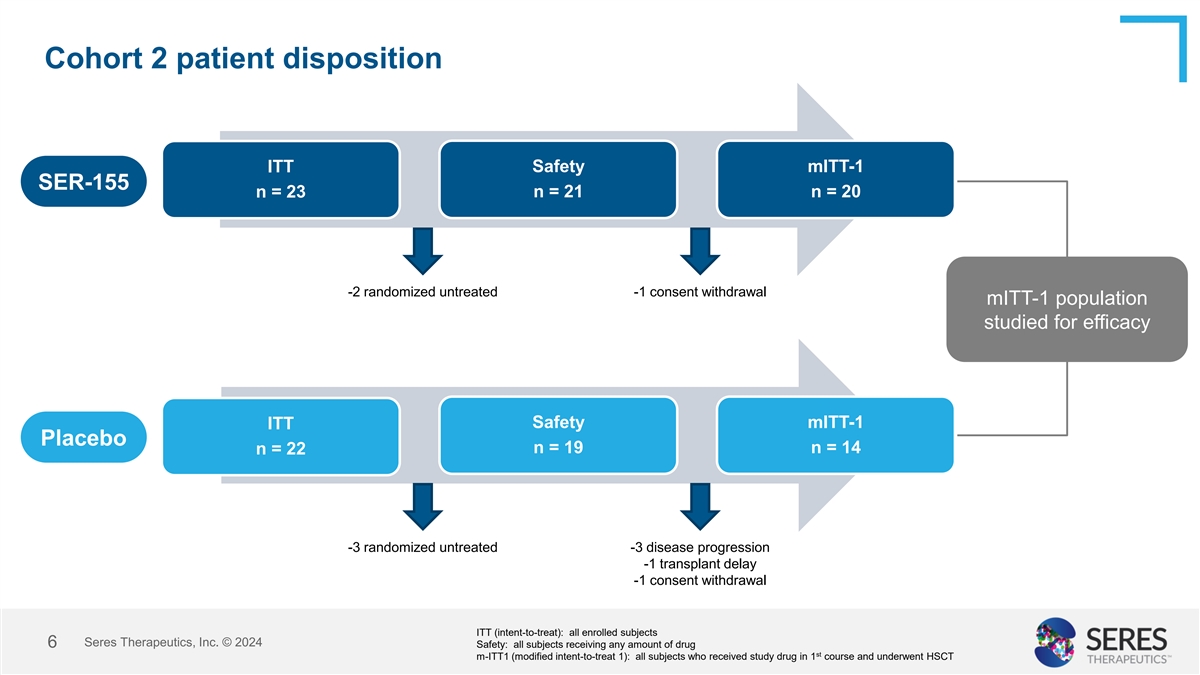 SER-155 1b期研究评估了成人allo-HSCT受体COHORT 1 COHORT 2开放标签(n = 15入组)的安全性、药理学和有效性(n = 15入组)安慰剂对照1:1(n = 45入组)SER-155 SER-155安慰剂结果报告于2023年5月结果于2024年9月公布主要终点:通过HSCT第100天的关键次要终点:•安全性和耐受性•血流感染(BSI)、胃肠道感染和急性GVHD ≥ 2级的发生率• SER-155细菌株植入•热性中性粒细胞减少症的发生率和持续时间•细菌病原体丰度于2023年12月获得美国FDA快速通道指定;打算追求突破性治疗指定丨Seres Therapeutics,Inc.丨© 赛里斯治疗公司