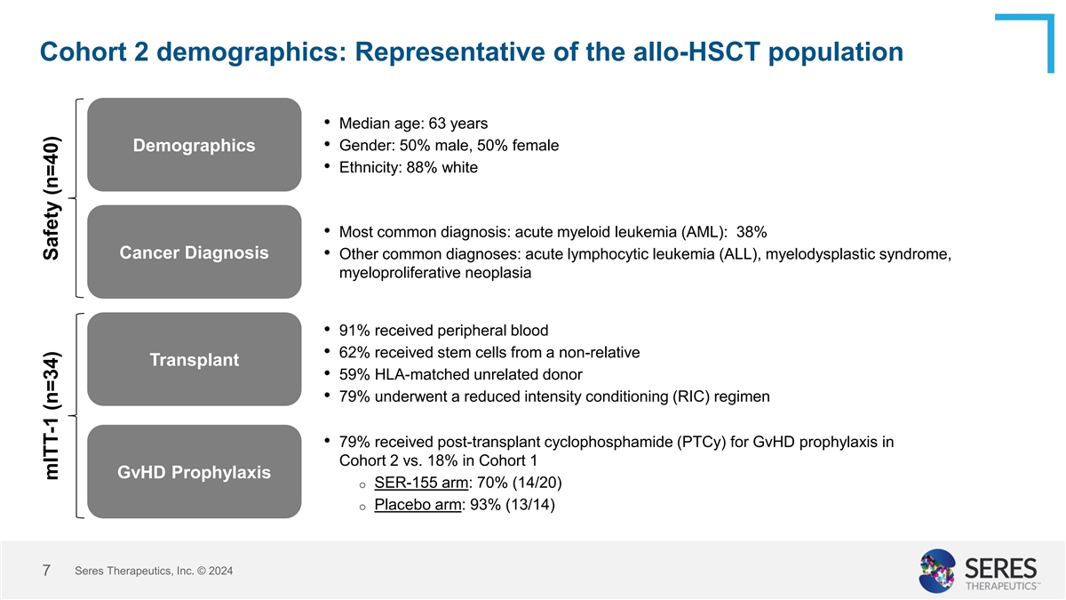 队列2患者处置ITT安全性mITT-1 SER-155 n = 23 n = 21 n = 20-2随机未经治疗-1同意撤回mITT-1人群的疗效安全性研究mITT-1丨ITT丨安慰剂n = 19 n = 14 n = 22-3随机未经治疗-3疾病进展-1移植延迟-1同意撤回ITT(意向治疗):所有入组受试者丨Seres Therapeutics,Inc. 赛里斯治疗公司 © 20246安全性:所有受试者接受任何数量的药物ST m-ITT1(改良意向治疗1):所有受试者在1个疗程内接受研究药物并接受HSCT