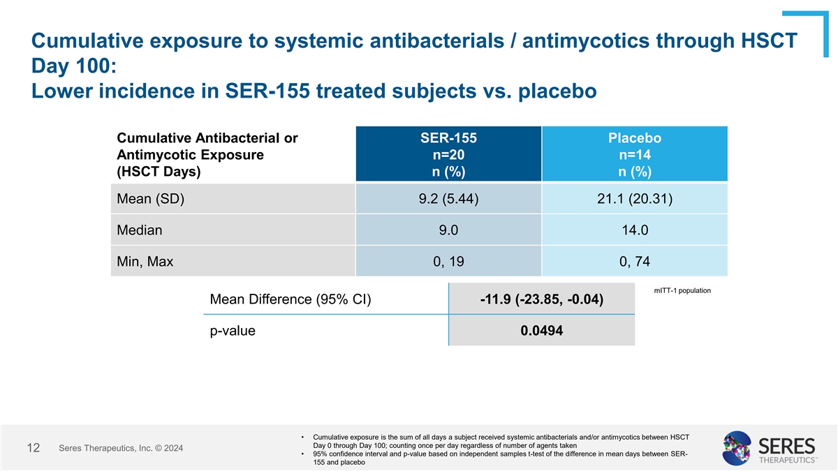 从HSCT第0天到第100天的热性中性粒细胞减少:从第0天到SER-155安慰剂第100天,SER-155治疗受试者的发病率低于安慰剂热性中性粒细胞减少n = 20 n = 14(#患者)n(%)n(%)受试者有FN 13(65.0)11(78.6)95%置信区间(40.8,84.6)(49.2,95.3)mITT-1人群优势比0.5 95%置信区间(0.07,2.99)p值0.4674 • CI:95%的2面Clopper-Pearson发病率置信区间应用了丨Seres Therapeutics 丨赛里斯治疗,Inc. © 202411 •优势比:对于95% 2边置信区间的治疗组(SER-155 vs.安慰剂)之间的发生率,根据Fisher精确检验计算出相应的p值