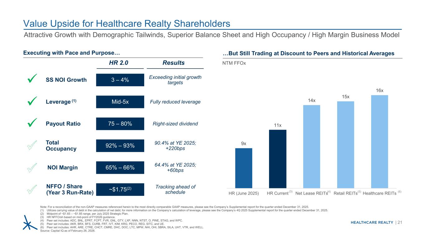 | 21 Healthcare Realty股东的价值上行空间注:有关此处引用的非GAAP衡量标准与最直接可比的GAAP衡量标准的对账,请参阅公司截至2025年12月31日的季度补充报告。(1)在计算净债务时使用债务的账面价值;有关公司计算杠杆的更多信息,请参阅公司截至2025年12月31日的季度的2025年第四季度补充报告。(2)根据2025年7月战略计划,中点~1.65美元–~1.85美元区间。(3)基于FY2026指引中点的HR NFFO/SH。(4)同行集包括:ADC、BNL、EPRT、FCPT、FVR、GNL、GTY、LXP、TERM5、NNN、NTST、O、PINE、STAG、WPC。(5)同行集包括:AKR、BRX、BFS、CURB、FRT、IVT、KIM、KRG、PECO、REG、SITC、UE。(6)同行集包括:AHR、ARE、CTRE、CHCT、CMRE、DHC、DOC、LTC、MPW、TERM5、NHI、OHI、TERM7、TERMSBRASBRA、Sila、UHT、VTR、well。资料来源:Capital IQ,截至2026年2月26日。HR 2.0中期-5x 75 – 80%~1.75美元(2)92% – 93% 65% – 66% 3 – 4%杠杆(1)派息率NFFO/股(第3年运行率)总占用率NOI利润率SS NOI增长完全降低了杠杆合适规模的股息在2025年提前跟踪90.4%;在2025年同比+ 220bps 64.4%;超过初始增长目标+ 60bps结果(3)……但仍以低于同行和历史平均水平的价格交易NTM FFOX按步伐执行和目的…(4)(5)(6)9x 11x 14x 15x 16x HR(2025年6月)HR当前净租赁REITs零售REITs医疗REITs具有吸引力的增长,具有人口顺风、优越的资产负债表和高入住率/高利润率的商业模式