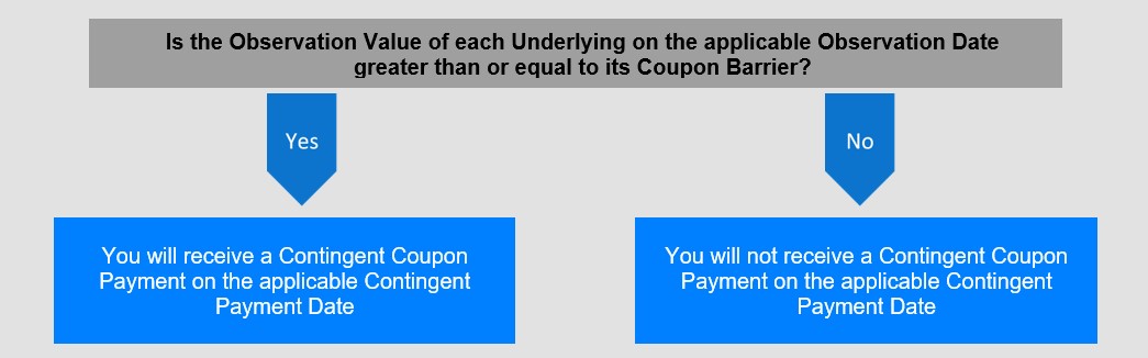 | 或有息票支付: | 如果,在任何季度观察日,观察值为每个基础大于或等于其息票障碍,我们将在适用的或有支付日(包括到期日)支付每1,000.00美元票据本金23.75美元的或有息票支付(相当于每季度2.375%的利率或每年9.50%的利率)。 |
