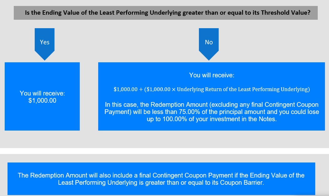•假设票据未在到期前被赎回,如果任何标的较其起始价值下跌超过25%,则在到期时,您的投资将面临表现最差的标的价值下降的1:1下行风险,最多100%的本金面临风险;否则,在到期时,您将收到本金金额。到期时,如果每个标的在最终观察日的收盘水平大于或等于其起始值的75.00%,您还将获得最终的或有息票支付。