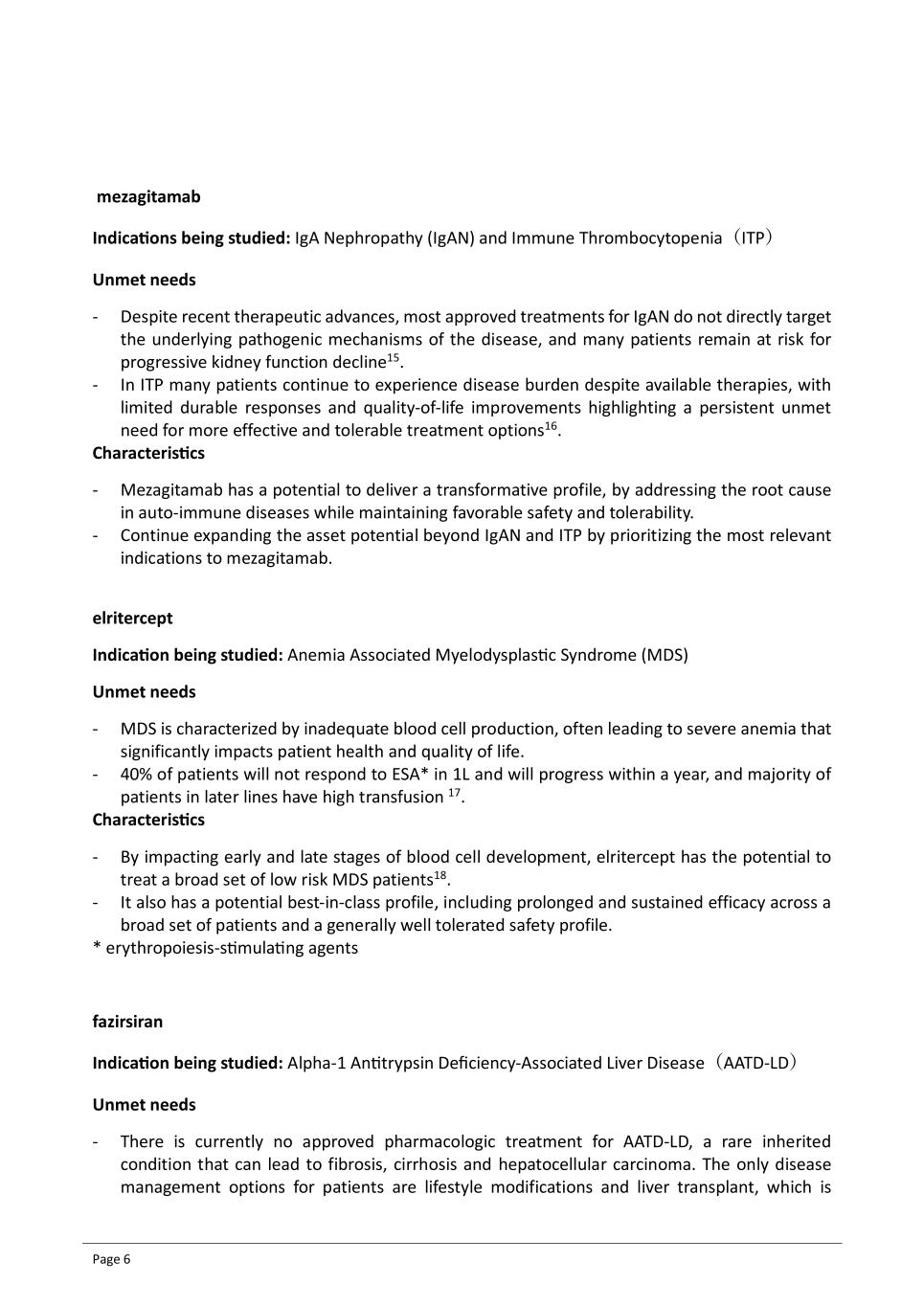 第6页mezagitamab正在研究的适应症:IgA肾病(IGAN)和免疫性血小板减少症(ITP)未满足的需求——尽管最近取得了治疗进展,但大多数获批的IGAN治疗方法并未直接针对该疾病的潜在致病机制,许多患者仍面临进行性肾功能下降的风险15。-在ITP中,尽管有可用的治疗方法,但许多患者继续经历疾病负担,有限的持久反应和生活质量的改善凸显出对更有效和可耐受的治疗方案的持续未满足需求16。特性-Mezagitamab通过解决自身免疫性疾病的根本原因,同时保持良好的安全性和耐受性,具有提供变革性概况的潜力。-通过优先考虑与美扎吉单抗最相关的适应症,继续扩大IgAN和ITP之外的资产潜力。正在研究的elritercept适应症:贫血相关骨髓增生异常综合征(MDS)未满足的需求-MDS的特点是血细胞生成不足,通常会导致严重的贫血,从而显着影响患者的健康和生活质量。-40%的患者对ESA不会有反应*在1L并将在一年内进展,后线大部分患者高输血17。特点-通过影响血细胞发育的早期和晚期阶段,elritercept有可能治疗广泛的低风险MDS患者18。-它还具有潜在的同类最佳特征,包括在广泛的患者群体中的长期和持续疗效,以及普遍耐受性良好的安全性特征。*正在研究的促红细胞生成药物fazirsiran适应症:Alpha-1抗胰蛋白酶缺乏相关肝病(AATD-LD)未满足的需求-AATD-LD是一种罕见的遗传性疾病,可导致纤维化、肝硬化和肝细胞癌,目前没有批准的药物治疗。患者唯一的疾病管理选择是改变生活方式和肝移植,这是