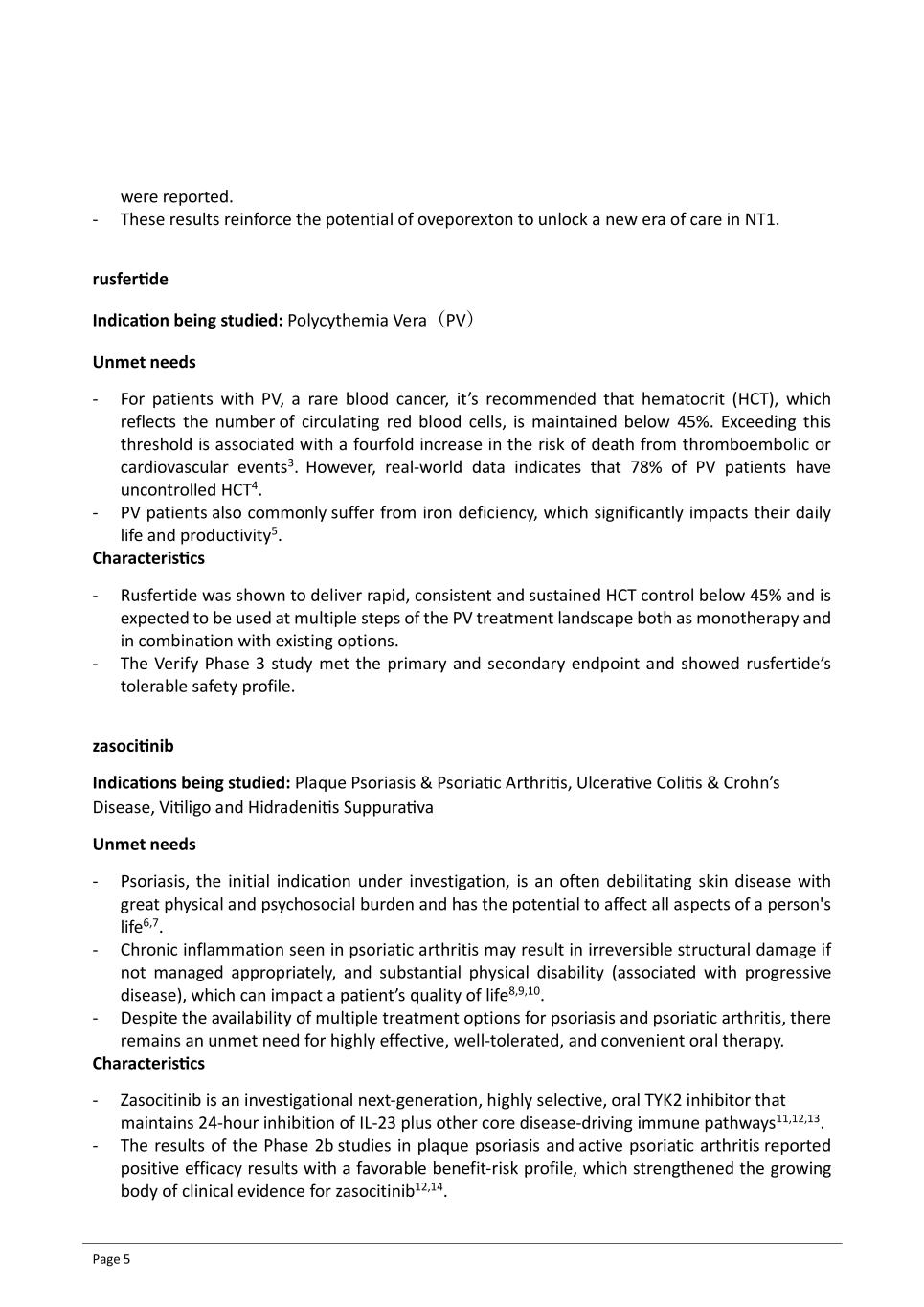 报道了第5页。-这些结果加强了oveporexton在NT1开启护理新纪元的潜力。正在研究的rusfertide适应症:真性红细胞增多症(PV)未满足的需求-对于PV这种罕见的血癌患者,建议将反映循环红细胞数量的血细胞比容(HCT)保持在45%以下。超过这一阈值与血栓栓塞或心血管事件导致的死亡风险增加四倍有关3。然而,真实世界的数据表明,78%的PV患者有无法控制的HCT4。-PV患者还普遍存在缺铁的情况,这严重影响了他们的日常生活和生产力5。特性-Rusfertide被证明可以提供低于45%的快速、一致和持续的HCT控制,预计将作为单一疗法和与现有方案联合使用在PV治疗领域的多个步骤中。-Verify 3期研究达到了主要和次要终点,并显示了rusfertide可耐受的安全性。正在研究的zasocitinib适应症:斑块状银屑病&银屑病关节炎、溃疡性结肠炎&克罗恩病、白癜风和化脓性汗腺炎未满足的需求-银屑病,正在研究的初始适应症,是一种经常使人衰弱的皮肤病,具有巨大的身体和心理社会负担,并有可能影响人生活的各个方面6,7。-银屑病关节炎中出现的慢性炎症如果管理不当,可能会导致不可逆的结构损伤,以及严重的身体残疾(与进行性疾病相关),这可能会影响患者的生活质量8,9,10。-尽管银屑病和银屑病关节炎有多种治疗方案可供选择,但对高效、耐受性好、方便的口服治疗的需求仍未得到满足。特性-Zasocitinib是一种在研的下一代、高度选择性的口服TYK2抑制剂,可维持24小时对IL-23以及其他核心疾病驱动免疫通路的抑制11,12,13。-斑块状银屑病和活动性银屑病关节炎的2b期研究结果报告了积极的疗效结果,具有有利的利益-风险特征,这加强了扎索替尼12、14越来越多的临床证据。