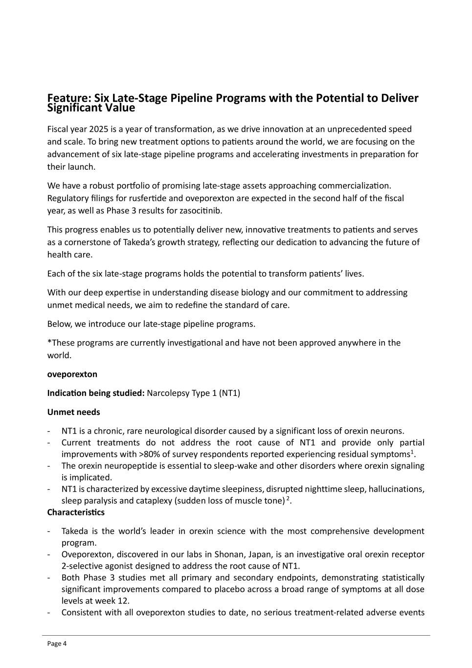 第4页特稿:六个有可能带来重大价值的后期管道计划2025财年是转型之年,因为我们以前所未有的速度和规模推动创新。为了给世界各地的患者带来新的治疗选择,我们正专注于推进六个后期管道项目,并加速投资以准备推出它们。我们拥有一个稳健的投资组合,其中包括接近商业化的有前途的后期资产。rusfertide和oveporexton的监管备案预计将在本财年下半年,以及zasocitinib的3期结果。这一进展使我们能够潜在地向患者提供新的创新治疗,并作为武田增长战略的基石,反映了我们致力于推进医疗保健的未来。六个后期项目中的每一个都有可能改变患者的生活。凭借我们在理解疾病生物学方面的深厚专业知识以及我们致力于解决未满足的医疗需求,我们的目标是重新定义护理标准。下面,我们介绍我们的后期管道程序。*这些项目目前正在研究中,尚未在世界任何地方获得批准。正在研究的oveporexton适应症:嗜睡症1型(NT1)未满足的需求-NT1是一种慢性、罕见的神经系统疾病,由食欲素神经元的显着丧失引起。-目前的治疗没有解决NT1的根本原因,仅提供部分改善,> 80%的调查受访者报告有残留症状1。-食欲素神经肽对于睡眠-觉醒和其他与食欲素信号传导有关的疾病至关重要。-NT1的特点是白天过度嗜睡、夜间睡眠中断、产生幻觉、睡眠麻痹和猝倒(肌肉张力突然丧失)2。特点-武田是世界领先的食欲素科学与最全面的开发方案。-Oveporexton,在我们位于日本湘南的实验室中发现,是一种研究性口服食欲素受体2-选择性激动剂,旨在解决NT1的根本原因。-两项3期研究均达到了所有主要和次要终点,表明与安慰剂相比,在第12周所有剂量水平的广泛症状范围内均有统计学上的显着改善。-与迄今为止所有oveporexton研究一致,没有严重的治疗相关不良事件