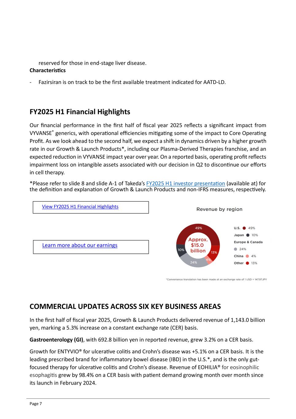 第7页为终末期肝病患者保留。特性-Fazirsiran有望成为首个适用于AATD-LD的可用治疗方法。FY2025H1财务亮点我们在2025财年上半年的财务表现反映了VYVANSE的重大影响®仿制药,运营效率减轻了对核心运营利润的部分影响。当我们展望下半年时,我们预计在我们的增长和推出产品的更高增长率的推动下,动态将发生转变*,包括我们的血浆衍生疗法特许经营权,以及预期的VYVANSE影响逐年减少。据报告,营业利润反映了与我们在第二季度决定停止细胞治疗努力相关的无形资产减值损失。*有关增长与发射产品和非国际财务报告准则措施的定义和解释,请分别参阅武田FY2025H1投资者介绍(可查阅)的幻灯片8和幻灯片A-1。商业更新跨越六个关键业务领域在2025财年上半年,Growth & Launch Products实现了11,430亿日元的收入,按固定汇率(CER)计算,增长了5.3%。Gastroenterology(GI)报告的收入为6928亿日元,按CER计算增长3.2%。ENTYVIO的增长®溃疡性结肠炎和克罗恩病的CER为+ 5.1%。是美国领先的炎症性肠病(IBD)处方品牌。*,并且是唯一针对溃疡性结肠炎和克罗恩病的以肠道为重点的疗法。EOHILIA收入®自2024年2月推出以来,随着患者需求逐月增长,嗜酸性食管炎的CER基础上增长了98.4%。查看FY2025 H1财务亮点了解有关我们收益的更多信息