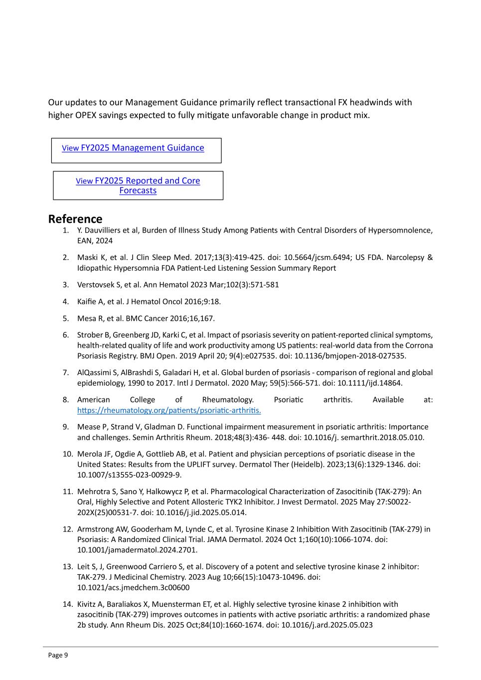 第9页我们对管理指南的更新主要反映了交易外汇逆风,预计更高的运营支出节省将充分缓解产品组合的不利变化。参考资料1。Y. Dauvilliers等人,在过度嗜睡的中枢性疾病患者中的疾病负担研究,EAN,20242。Maski K,et al. J Clin Sleep Med. 2017;13(3):419-425. doi:10.5664/jcsm.6494;美国FDA。嗜睡症和特发性嗜睡症FDA患者主导的听课总结报告3。Verstovsek S,et al. Ann Hematol 2023 Mar;102(3):571-581 4。Kaifie A,et al. J Hematol Oncol 2016;9:18。5.Mesa R,et al. BMC Cancer 2016;16,167。6.Strober B、Greenberg 京东、Karki C等人。银屑病严重程度对美国患者中患者报告的临床症状、与健康相关的生活质量和工作效率的影响:来自corrona银屑病登记处的真实世界数据。BMJ公开赛。2019年4月20日;9(4):e027535.doi:10.1136/bmjopen-2018-027535。7.AlQassimi S,AlBrashdi S,Galadari H,et al. Global burden of soriasis-comparison of regional and global epidemiology,1990 to 2017。Intl J Dermatol。2020年5月;59(5):566-571。doi:10.1111/ijd.14864。8.美国风湿病学院。银屑病关节炎。可查阅:https://rheumatology.org/patients/psoriatic-arthritis。9.Mease P,Strand V,Gladman D.银屑病关节炎的功能障碍测量:重要性和挑战。精液关节炎风湿。2018;48(3):436-448.doi:10.10 16/j. semarthrit.2018.05.010。10.Merola JF,OGdie A,Gottlieb AB,et al.患者和医生对美国银屑病的看法:UPLIFT调查的结果。Dermatol Ther(Heidelb)。2023;13(6):1329-1346。doi:10.1007/s13555-023-00929-9。11.Mehrotra S、Sano Y、Halkowycz P等Zasocitinib(TAK-279)的药理表征:一种口服、高选择性和强效变构TYK2抑制剂。J投资Dermatol。2025年5月27日:S0022-202X(25)00531-7。doi:10.10 16/j.jid.2025.05.014。12.Armstrong AW、Gooderham M、Lynde C等人Zasocitinib(TAK-279)抑制酪氨酸激酶2治疗银屑病:一项随机临床试验。JAMA Dermatol。2024年10月1日;160(10):1066-1074。doi:10.1001/jamadermatol.2024.2701。13.Leit S,J,Greenwood Carriero S等人。发现一种强效选择性酪氨酸激酶2抑制剂:TAK-279。J药物化学。2023年8月10日;66(15):10473-10496。doi:10.1021/acs.jmedchem.3c0060014。Kivitz A、Baraliakos X、Muensterman ET等人。高选择性酪氨酸激酶2抑制与zasocitinib(TAK-279)改善活动性银屑病关节炎患者的预后:一项随机2b期研究。Ann Rheum DIS。2025年10月;84(10):1660-1674.doi:10.10 16/j.ard.2025.05.023查看FY2025管理层指导意见查看FY2025报告和核心预测