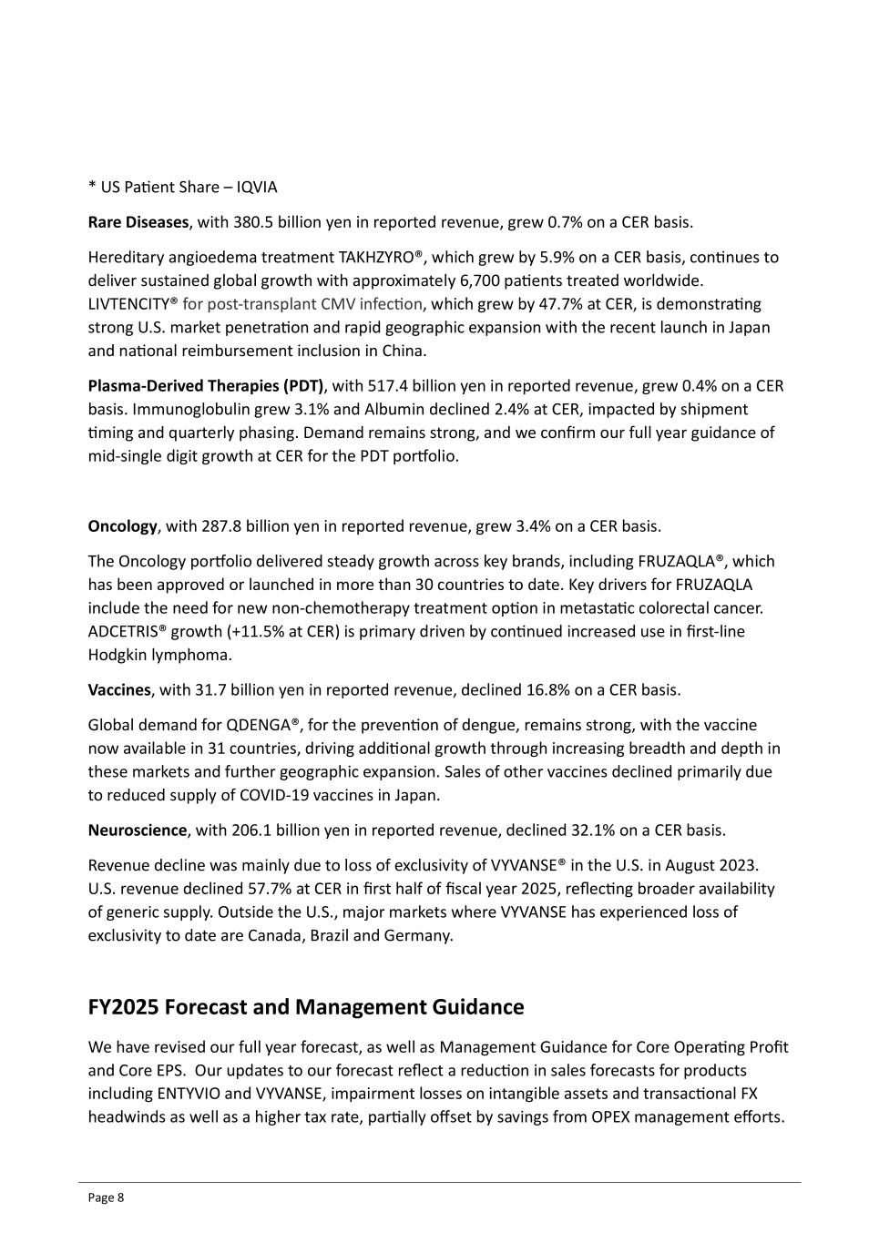 第8页*美国患者份额– 艾昆纬罕见病报告收入为3805亿日元,按CER计算增长0.7%。遗传性血管性水肿治疗TAKHZYRO®在CER基础上增长了5.9%,继续实现持续的全球增长,全球约有6700名患者接受了治疗。活力城市®对于移植后CMV感染,CER增长了47.7%,随着最近在日本的推出和中国的国家报销纳入,正显示出强大的美国市场渗透率和快速的地域扩张。血浆衍生疗法(PDT),报告的收入为5174亿日元,按CER计算增长0.4%。按CER计算,免疫球蛋白增长3.1%,白蛋白下降2.4%,受出货时间和季度分阶段影响。需求依然强劲,我们确认我们对PDT产品组合的CER全年中个位数增长的指导。肿瘤学报告收入为2878亿日元,按CER计算增长3.4%。The Oncology组合在包括FRUZAQLA在内的主要品牌实现了稳健增长®,迄今已在30多个国家获批或推出。FRUZAQLA的关键驱动因素包括在转移性结直肠癌中需要新的非化疗治疗方案。ADCETRIS®增长(CER为+ 11.5%)的主要驱动因素是一线霍奇金淋巴瘤的使用持续增加。疫苗,报告的收入为317亿日元,按CER计算下降了16.8%。全球对QDENGA的需求®,用于预防登革热的疫苗仍然强劲,目前已在31个国家提供疫苗,通过增加这些市场的广度和深度以及进一步的地域扩张推动额外增长。其他疫苗销量下降主要是由于日本新冠疫苗供应减少。Neuroscience,报告的收入为2061亿日元,按CER计算,下降了32.1%。收入下降主要是由于VYVANSE的排他性丧失®于2023年8月在美国上市。2025财年上半年美国收入按CER计算下降57.7%,反映出仿制药供应范围扩大。在美国以外,VYVANSE迄今失去排他性的主要市场是加拿大、巴西和德国。FY2025预测和管理层指引我们修正了全年预测,以及管理层对核心经营利润和核心EPS的指引。我们对预测的更新反映了对包括ENTYVIO和VYVANSE在内的产品销售预测的下调、无形资产减值损失和交易外汇逆风以及更高的税率,部分被OPEX管理工作的节省所抵消。