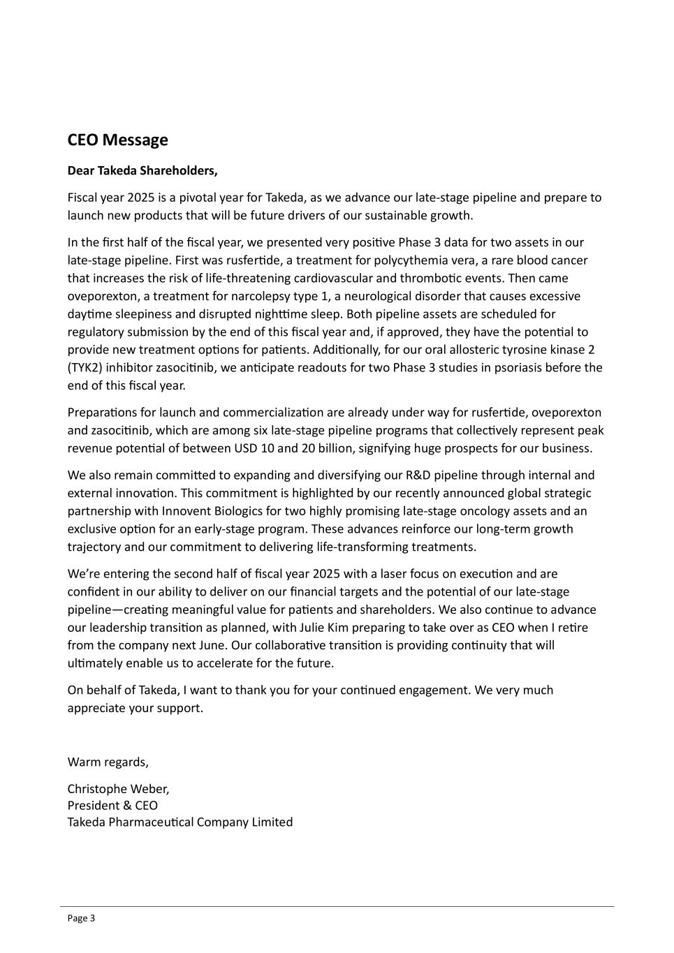 第3页CEO致辞尊敬的武田股东,2025财年对武田来说是关键的一年,因为我们正在推进我们的后期管道,并准备推出新产品,这些产品将成为我们可持续增长的未来驱动力。在本财年上半年,我们为处于后期阶段的两项资产提供了非常积极的第3阶段数据。首先是rusfertide,这是一种治疗真性红细胞增多症的药物,这是一种罕见的血癌,会增加发生危及生命的心血管和血栓事件的风险。随后出现了oveporexton,这是一种治疗1型发作性睡病的药物,这是一种导致白天过度嗜睡并扰乱夜间睡眠的神经系统疾病。这两项管道资产计划在本财年年底前提交监管机构,如果获得批准,它们有可能为患者提供新的治疗选择。此外,对于我们的口服变构酪氨酸激酶2(TYK2)抑制剂zasocitinib,我们预计在本财政年度结束前会有两项银屑病3期研究的读数。rusfertide、oveporexton和zasocitinib的上市和商业化准备工作已经在进行中,这六个后期管道项目共同代表了100至200亿美元的峰值收入潜力,标志着我们业务的巨大前景。我们还继续致力于通过内部和外部创新扩大和多样化我们的研发管道。我们最近宣布与信达生物就两项极具前景的晚期肿瘤学资产和一个早期项目的独家选择权建立全球战略合作伙伴关系,突出了这一承诺。这些进步强化了我们的长期增长轨迹以及我们提供改变生活的治疗的承诺。我们将进入2025财年下半年,重点放在执行上,并对我们实现财务目标的能力和后期管道的潜力充满信心——为患者和股东创造有意义的价值。我们还将继续按计划推进领导层换届,Julie Kim准备在明年6月我从公司退休时接任首席执行官一职。我们的协作过渡正在提供连续性,最终将使我们能够为未来加速。我谨代表武田感谢您一直以来的参与。我们非常感谢您的支持。温馨问候丨Christophe Weber,总裁兼首席执行官Takeda Pharmaceutical Company Limited