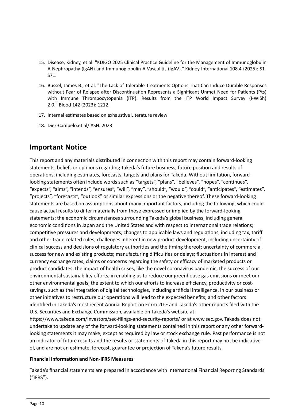 第10页15。Disease,Kidney,et al.“KDIGO2025年免疫球蛋白A肾病(IGAN)和免疫球蛋白A血管炎(IGAV)管理临床实践指南”肾脏国际108.4(2025):S1-S71。16.Bussel,James B.等人。“缺乏可以诱导持久反应而无需担心停药后复发的可容忍的治疗方案,这代表了免疫性血小板减少症(ITP)患者(PT)的显着未满足需求:ITP世界影响调查(I-WISH)2.0的结果。”血液142(2023):1212。17.内部估算基于详尽的文献综述18。Diez-Campelo等人/ASH。2023重要通知本报告以及与本报告相关的任何分发材料可能包含有关武田未来业务、未来地位和经营结果的前瞻性陈述、信念或意见,包括对武田的估计、预测、目标和计划。没有限制,前瞻性陈述通常包括“目标”、“计划”、“相信”、“希望”、“继续”、“预期”、“目标”、“打算”、“确保”、“将”、“可能”、“应该”、“将”、“可能”、“预期”、“估计”、“项目”、“预测”、“展望”或类似表述或其否定。这些前瞻性陈述基于对许多重要因素的假设,包括以下因素,这些因素可能导致实际结果与前瞻性陈述明示或暗示的结果存在重大差异:围绕武田全球业务的经济环境,包括日本和美国的总体经济状况以及国际贸易关系;竞争压力和发展;适用法律法规的变化,包括税收、关税和其他与贸易相关的规则;新产品开发中固有的挑战,包括临床成功和监管机构的决定及其时间的不确定性;新产品和现有产品商业成功的不确定性;制造困难或延误;利率和货币汇率的波动;关于已上市产品或候选产品的安全性或有效性的索赔或担忧;健康危机的影响,如新型冠状病毒大流行;我们的环境可持续性努力的成功,使我们能够减少温室气体排放或实现我们的其他环境目标;我们提高效率、生产力或成本节约的努力的程度,例如将包括人工智能在内的数字技术纳入我们的业务或其他重组我们业务的举措将带来预期收益;以及武田最近的20-F表格年度报告和武田向美国证券交易委员会提交的其他报告中确定的其他因素,可在武田的网站上查阅:https://www.takeda.com/investors/sec-filings-and-security-reports/或www.sec.gov。武田不承诺更新本报告中包含的任何前瞻性陈述或其可能做出的任何其他前瞻性陈述,除非法律或证券交易所规则要求。过去的业绩不是未来业绩的指标,武田在本报告中的业绩或陈述可能不是指示性的,也不是对武田未来业绩的估计、预测、保证或预测。财务信息和非国际财务报告准则措施武田的财务报表是根据国际财务报告准则(“IFRS”)编制的。