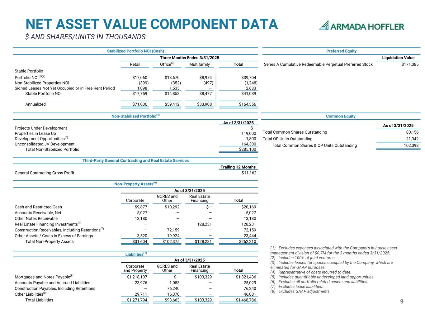 9净资产价值构成数据(1)不包括截至2025年3月31日止3个月与公司内部资产管理部门相关的费用70万美元。(2)包括100%的合资企业。(3)包括公司占用的空间的租赁,这些租赁为公认会计原则的目的而消除。(4)至今发生的费用代表。(5)包括可量化的未开发土地机会。(6)不包括所有与投资组合相关的资产和负债。(7)不包括租赁负债。(8)不包括GAAP调整。$及股份/单位单位单位单位单位单位单位单位单位单位单位单位单位单位单位单位单位单位单位单位单位单位单位单位单位单位单位单位单位单位单位单位单位单位单位单位单位单位单位单位单位单位单位单位单位单位单位单位单位单位单位单位单位单位单位单位单位单位单位单位单位单位单位单位单位单位单位单位单位单位单位单位单位单位单位单位单位单位单位单位单位单位单位单位单位单位单位单位单位单位单位单位单位单位单位单位单位单位单位单位单位单位单位单位单位单位单位单位单位单位单位单位单位单位单位单位单位单位单位单位单位单位单位单位单位单位单位单位单位单位单位单位单位单位单位单位单位单位单位单位单位单位单位单位单位单位单位单位单位单位单位单位单位单位单位单位单位单位单位单位单位单位单位单位单位单位单位单位单位单位单位单位单位单位单位单位单位单位单位单位单位单位单位单位单位单位单位单位单位单位单位单位和房地产服务过去12个月总承包毛利润11,162美元非财产资产(6)截至2025年3月31日公司GCRES和其他房地产融资总现金和受限现金9,877美元10,292美元— 20,169美元应收账款净额5,027 —— 5,027其他应收票据13,180 —— 13,180房地产融资投资(7)—— 128,231128,231应收建筑款项,包括留存(7)— 72,159 — 72,159其他资产/超额收益成本3,520 19,924 — 23,444非财产资产总额31,604美元102,375美元128,231美元262,210美元负债(7)截至2025年3月31日公司和财产GCRES和其他房地产融资抵押贷款和应付票据总额(8)1,218,107美元— 103,329美元1,321,436应付账款和应计负债23,9761,053 — 25,029应付建筑款,包括留存— 76,240 — 76,240其他负债(8)29,71116,370 — 46,081负债总额1,271,794美元93,663美元103,329美元1,468,786美元优先股清算价值系列A累计可赎回永久优先股171,085美元截至2025年3月31日的普通股已发行普通股总数80,156已发行OP单位总数21,942已发行普通股和OP单位总数102,098