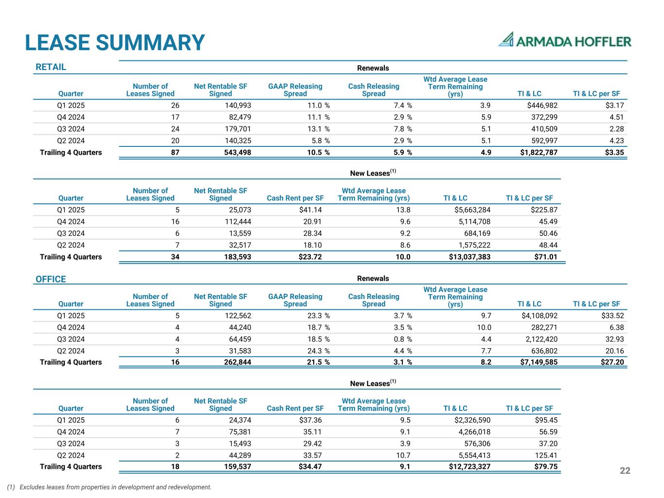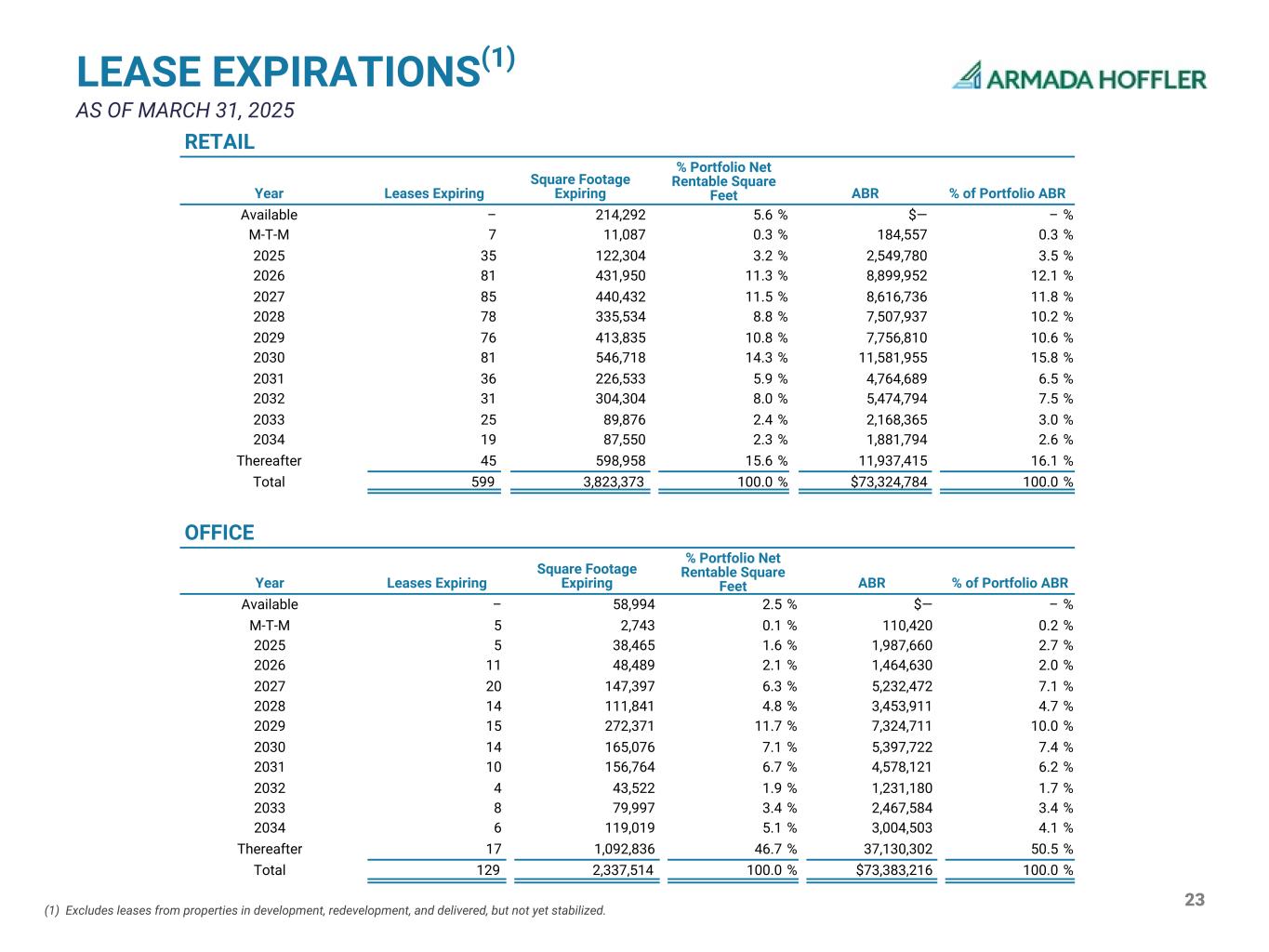 22租赁概要(1)不包括来自开发和再开发物业的租赁。RETAIL Renewals Quarter Number of leases signed net rentable SF signed GAAP releasing spread cash releasing spread WTD average lease term remaining(yrs)TI & LC TI & LC per SF Q1 202526140,99311.0% 7.4% 3.9 $ 446,982 $ 3.17 Q4 20241782,47911.1% 2.9% 5.9 372,2994.51 Q3 2024179,70113.1% 7.8% 5.14 10,5092.28 Q2 202420140,3255.8% 2.9% 5.1592,9974.23 Trailing 4 Quarters 87543,49810.5% 5.9% 4.9 $ 1,822,787 $ 3.35 New Leases(1)Quarter Number of leases sign租金每顺丰WTD平均租赁期限剩余(年)TI & LC TI & LC每顺丰Q1 2025525,073 $ 41.14 13.8 $ 5,663,284 $ 225.87 Q4 202416112,44420.9 19.65,114,70845.49 Q3 2024613,55928.349.2684,16950.46 Q2 2024732,51718.108.61,575,22248.44后4季度34183,593 $ 23.72 10.0 $ 13,037,383 $ 71.01办公室续约季度签订的租赁数量净可租顺丰签署的GAAP释放利差现金释放利差WTD平均租赁期限剩余(年)TI & LC每顺丰Q1 20255122,56223.3% 3.7% 9.7 $ 4,108,092$ 33.52 Q4 2024444,24018.7% 3.5% 10.0282,2716.38 Q3 2024464,45918.5% 0.8% 4.42,122,42032.93 Q2 2024331,58324.3% 4.4% 7.7636,80220.16尾随4个季度16262,84421.5% 3.1% 8.2 $ 7,149,585 $ 27.20新租约(1)季度签署的租约数量SF签署的净可出租SF签署的现金租金每SF WTD平均租赁期限剩余(yrs)TI & LC TI & LC每SF Q1 2025624,374 $ 37.369.5 $ 2,326,590 $ 95.45 Q4 20247775,38135.1 19.14,266,01856.59 Q3 2024315,49329.42 3.9 576,30637.202024年第二季度244,28933.57 10.75,554,413125.41过去4个季度18159,537美元34.479.1美元12,723,327美元79.75