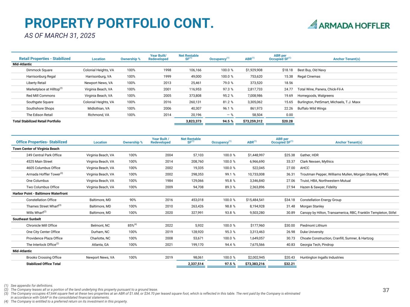 37 Property Portfolio CONT。截至2025年3月31日零售物业-稳定的位置所有权%年已建成/重新开发的净可租SF(1)入住率(1)ABR(1)ABR per occupied SF(1)Anchor Tenant(s)Mid-Atlantic Dimmock Square Colonial Heights,VA 100% 1998106,166100.0% $ 1,929,908 $ 18.18 百思买,Old Navy Harrisonburg Regal Harrisonburg,VA 100% 199949,000100.0% 753,62015.38 Regal Cinemas Liberty Retail Newport News,VA 100% 201325,46179.0% 373,5201.56 Marketplace at Hilltop(2)Virginia Beach,VA 100% 2001116,95397.3% 2,817,73324。VA 100% 2005373,80895.2% 7,008,98619.69 Homegoods,Walgreens Southgate Square Colonial Heights,VA 100% 2016260,13181.2% 3,305,06215.65 Burlington,PetSmart,Michaels,T.J. Maxx Southshore Shops Midlothian,VA 100% 200640,30796.1% 861,97322.26 布法罗鸡翅烧烤吧 the Edison Retail Richmond,VA 100% 201420,196—% 58,5040.00稳定的零售组合总额3,823,37394.5% $ 73,259,312 $ 20.28(1)定义见附录。(2)公司依据地面租约租赁该物业所依据的全部或部分土地。(3)公司在这两个物业中占有47,644平方英尺,ABR为160万美元,即每租赁平方英尺34.70美元,这反映在本表中。公司支付的租金在合并财务报表中按照公认会计原则予以抵销。(4)公司有权就其对该物业的投资获得优先回报。办公物业-稳定的位置所有权%年已建成/重新开发的净可租SF(1)入住率(1)ABR(1)ABR per occupied SF(1)Anchor Tenant(s)Town Center of Virginia Beach 249 Central Park Office Virginia Beach,VA 100% 200457,103100.0% $ 1,448,997 $ 25.38 Gather,HDR 4525 Main Street Virginia Beach,VA 100% 2014208,760100.0% 6,966,69033.37 Clark Nexsen,Mythics 4605 Columbus Office Virginia Beach,VA 100% 200219,335 100.0% 522,04527.00 AHCC Armada Hoffler Tower(3)Virginia Beach,VA 100% 2002298,35399.1% 10,733,VA 100% 1984129,06695.8% 3,346,84027.06 Truist,HBA,Northwestern Mutual Two Columbus Office Virginia Beach,VA 100% 2009年94,70889.3% 2,363,89627.94 Hazen & Sawyer,Fidelity Harbor Point-Baltimore Waterfront Constellation Office Baltimore,MD 90% 2016453,018100.0% $ 15,484,541 $ 34.18 星群能源 Thames Street Wharf(3)Baltimore,MD 100% 2010263,42698.8% 8,194,92831.48丨摩根士丹利丨Wills Wharf(2)Baltimore,MD 100% 2020327,99193.8% 9,503,28030.89 Canopy by Hilton,TransamerNC 85%(4)20225,932100.0% $ 177,960 $ 30.00 Piedmont Lithium One City Center Office Durham,NC 100% 2019128,92095.3% 3,313,46326.98 Duke University Providence Plaza Office Charlotte,NC 100% 200853,671100.0% 1,649,05730.73 Choate Construction,Cranfill,Sumner,& Hartzog The Interlock Office(2)Atlanta,GA 100% 2021199,17094.4% 7,675,56640.83 Georgia Tech,Pindrop Mid-Atlantic Brooks Crossing Office Newport News,VA 100% 201998,061100.0% $ 2,002,945 $ 20.43丨Huntington Ingalls Industries 丨亨廷顿英戈尔斯工业稳定办公室总计2,337,514