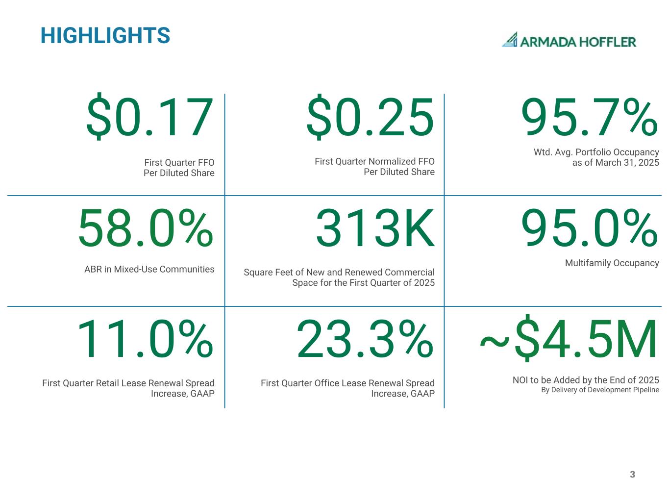 3大亮点0.17美元第一季度FFO每股稀释股份0.25美元第一季度正常化FFO每股稀释股份95.7% WTD。平均。截至2025年3月31日的组合入住率58.0%混合用途社区ABR 2025年第一季度新建和更新商业空间313K平方英尺95.0%多户住宅入住率11.0%第一季度零售租赁续订价差增加,GAAP 23.3%第一季度办公室租赁续订价差增加,GAAP~450万美元NOI将在2025年底通过交付开发管道增加