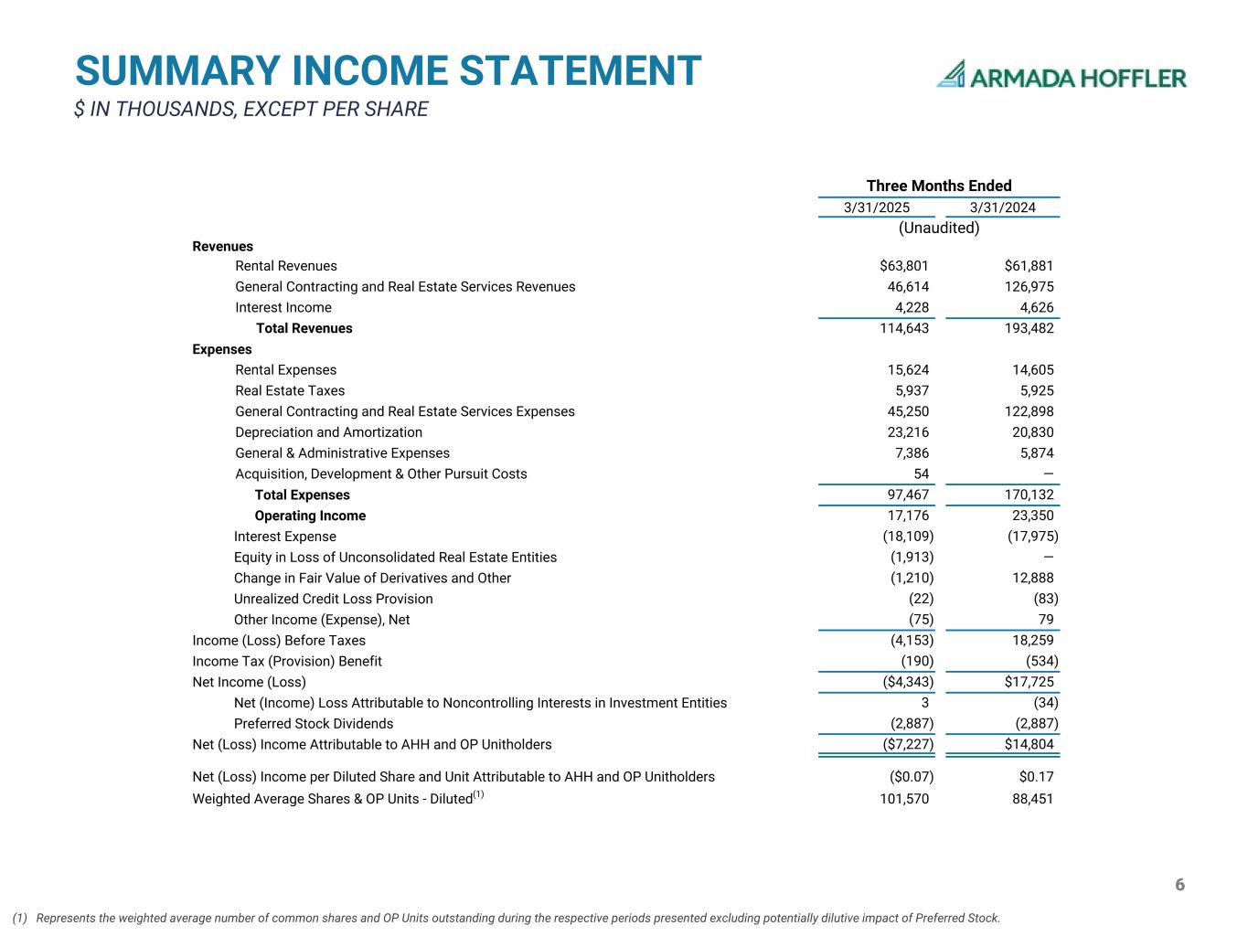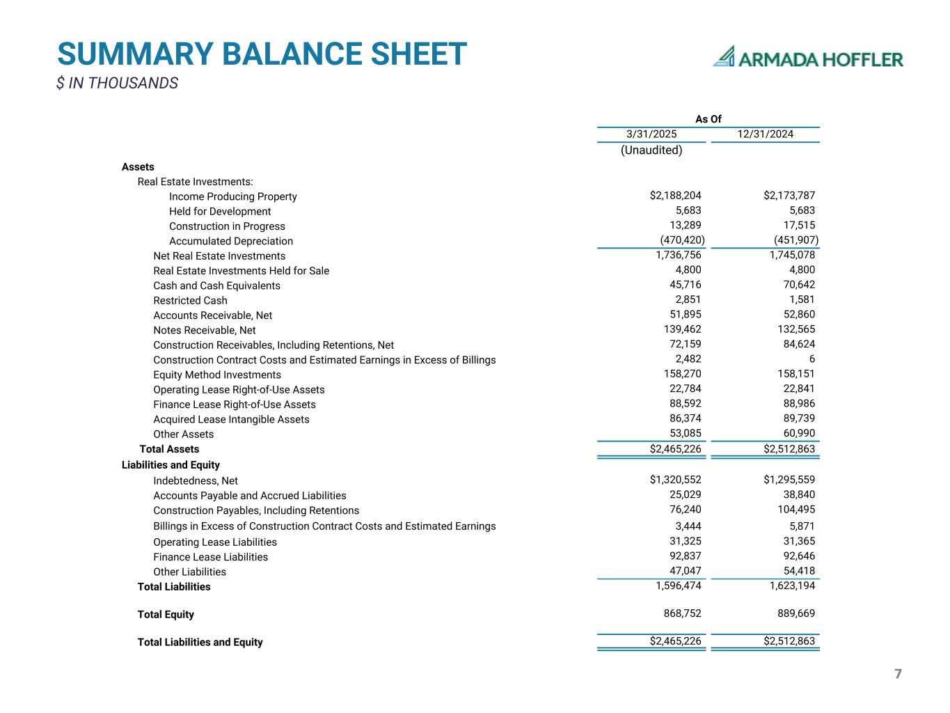 6截至3/31/20253/31/2024止三个月(未经审计)收入租金收入$ 63,801 $ 61,881总承包和房地产服务收入46,614126,975利息收入4,2284,626总收入114,643193,482费用租金费用15,62414,605房地产税5,9375,925总承包和房地产服务费用45,250122,898折旧和摊销23,21620,830一般和行政费用7,3865,874购置,开发&其他追求成本54 —总费用97,467170,132营业收入17,17623,350利息费用(18,109)(17,975)未合并房地产实体损失中的权益(1,913)—衍生品及其他公允价值变动(1,210)12,888未实现信用损失准备(22)(83)其他收入(费用),税前净收益(75)79税前收入(亏损)(4,153)18,259所得税(拨备)收益(190)(534)净收入(亏损)(4,343美元)17,725美元归属于投资实体非控制性权益的净(收入)亏损3(34)优先股股息(2,887)(2,887)归属于AHH和OP单位持有人的净(亏损)收入(7,227美元)14,804美元每股摊薄后净(亏损)收入和归属于AHH和OP单位持有人的单位(0.07美元)0.17美元加权平均股份和OP单位-稀释后(1)101,57088,451简表,单位:千美元,除每股(1)外,代表在列报的相应期间内已发行普通股和OP单位的加权平均数,不包括优先股的潜在稀释影响。