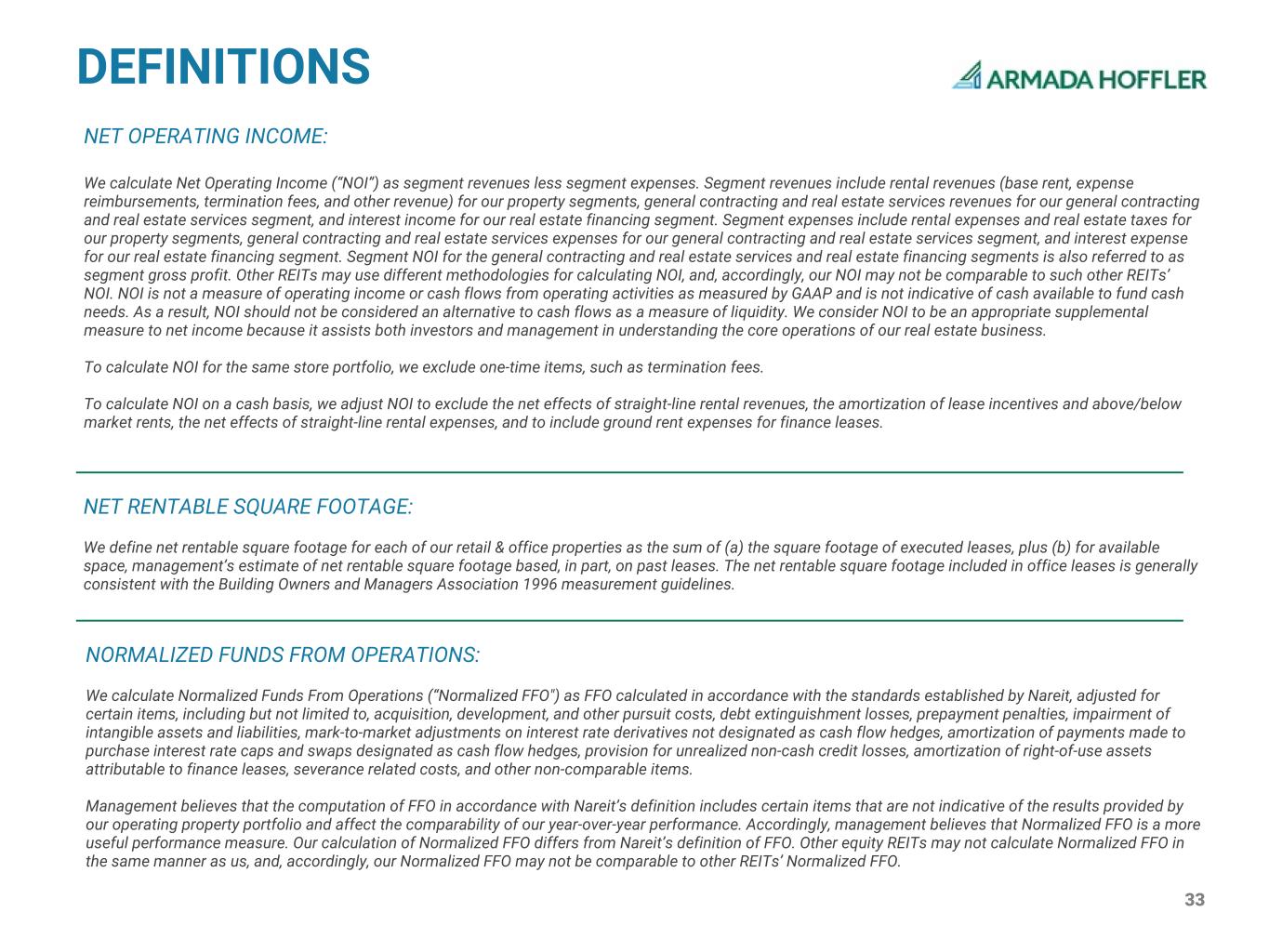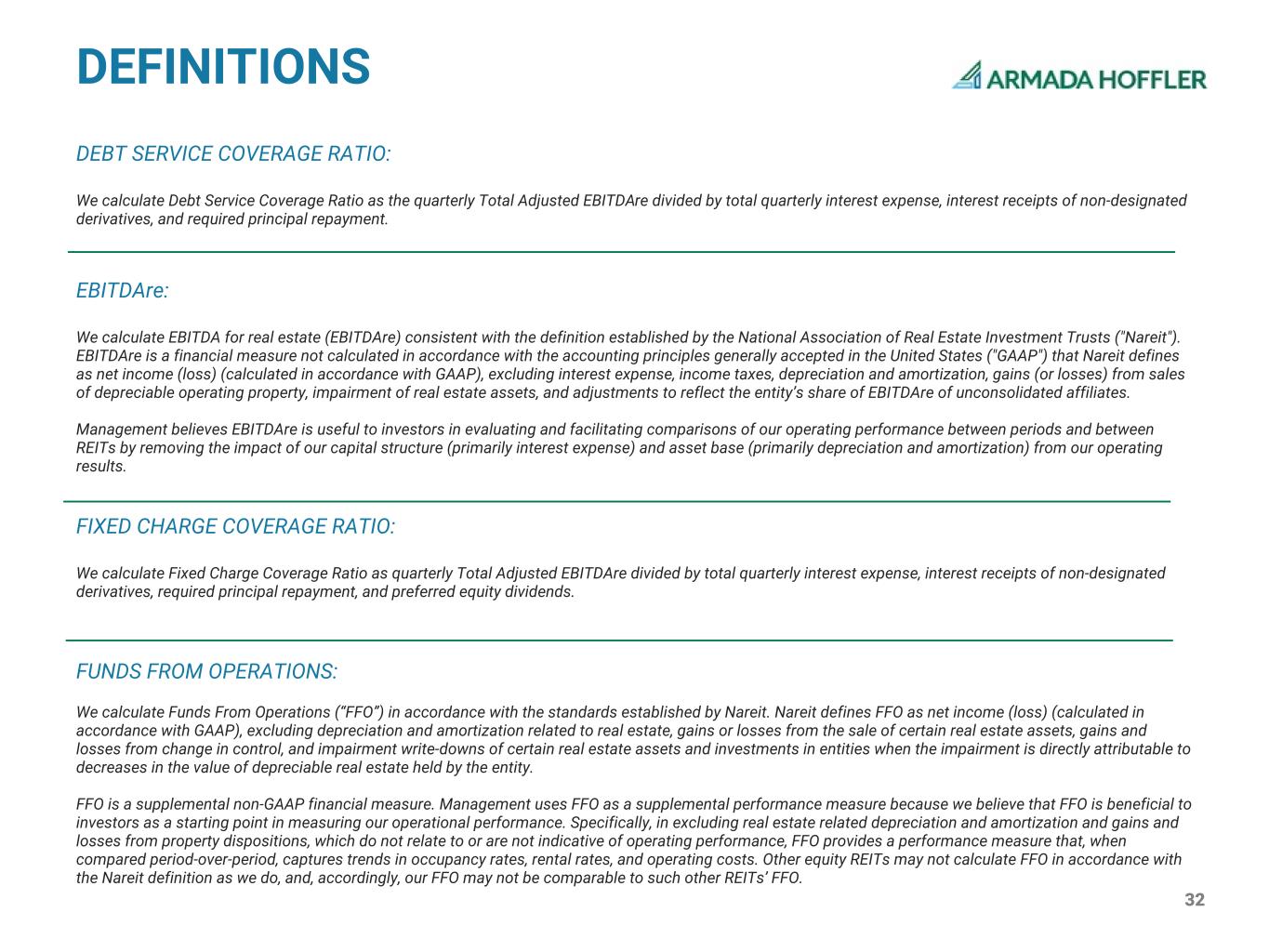 32定义EBITDA:我们计算房地产EBITDA(EBITDA)与美国全国房地产投资信托协会(“Nareit”)建立的定义一致。EBITDA是一种不按照美国普遍接受的会计原则(“GAAP”)计算的财务指标,Nareit将其定义为净收入(亏损)(按照GAAP计算),不包括利息费用、所得税、折旧和摊销、出售可折旧经营财产的收益(或损失)、房地产资产减值以及反映实体在未合并关联公司的EBITDA中所占份额的调整。管理层认为,通过从我们的经营业绩中剔除我们的资本结构(主要是利息支出)和资产基础(主要是折旧和摊销)的影响,EBITDA有助于投资者评估和促进我们在不同时期和REITs之间的经营业绩比较。固定费用覆盖率:我们计算固定费用覆盖率为季度调整后EBITDA总额除以季度利息支出总额、非指定衍生品的利息收入、所需本金偿还、优先股股息。债务服务覆盖率:我们计算偿债覆盖率为季度调整后EBITDA总额除以季度利息支出总额、非指定衍生品的利息收入以及所需本金偿还。来自运营的资金:我们根据Nareit制定的标准计算来自运营的资金(“FFO”)。Nareit将FFO定义为净收入(亏损)(按照公认会计原则计算),不包括与房地产相关的折旧和摊销、出售某些房地产资产的收益或损失、控制权变更的收益和损失,以及当减值直接归因于实体持有的可折旧房地产价值下降时,某些房地产资产和实体投资的减值减记。FFO是一种补充性的非GAAP财务指标。管理层使用FFO作为补充绩效衡量标准,因为我们认为FFO作为衡量我们运营绩效的起点对投资者有利。具体地说,在排除与房地产相关的折旧和摊销以及与经营业绩无关或不代表经营业绩的财产处置损益时,FFO提供了一种业绩衡量标准,当与期间进行比较时,它可以捕捉到出租率、租金和经营成本的趋势。其他权益型REITs可能不会像我们一样按照Nareit定义计算FFO,因此,我们的FFO可能无法与其他此类REITs的FFO进行比较。