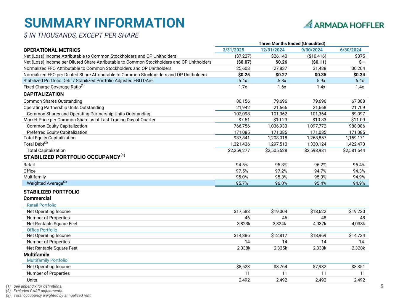 5(1)定义见附录。(2)不包括GAAP调整。(3)按年化租金加权的总占用。汇总信息$以千为单位,每股不包括截至三个月(未经审计)的经营指标3/31/202512/31/20249/30/20246/30/2024归属于普通股股东和OP单位持有人的净(亏损)收入(7,227美元)26,140美元(10,416美元)375美元归属于普通股股东和OP单位持有人的每股稀释后净(亏损)收入(0.07美元)0.26美元(0.11美元)$ —归属于普通股股东和OP单位持有人的正常化FFO 25,60827,83731,43830,204归属于普通股股东的每股稀释后的正常化FFO和OP单位持有人$ 0.25 $ 0.27 $ 0.35 $ 0.34稳定投资组合债务/稳定投资组合调整后EBITDA为5.4x 5.8x 5.9x 6.4x固定费用覆盖率(1)1.7x 1.6x 1.4x 1.4x资本化已发行普通股80,15679,69679,696667,388已发行运营合伙单位21,94221,66621,66821,709普通股和经营合伙单位未偿还102,098101,362101,36489,097每普通股市场价格截至本季度最后一个交易日$ 7.51 $ 10.23 $ 10.83 $ 11.09普通股本766,7561,036,9331,097,772988,086优先股资本化171,085171,085171,085171,085总股本937,8411,208,0181,268,8571,159,171总债务(2)1,321,4361,297,5101,330,1241,422,473总资本$ 2,259,277 $ 2,505,528 $ 2,598,981 $ 2,581,644稳定投资组合职业(1)零售94.5% 95.3% 96.2% 95.4%办公97.5% 97.2% 94.7% 94.3%多户95.0% 95.3% 95.3% 94.9%加权平均(3)95.7464848净可租平方英尺3,823k 3,824k 4,037 k 4,038 k办公室组合净营业收入$ 14,886 $ 12,817 $ 18,969 $ 14,734物业数量14141414净可租平方英尺2,338k 2,335k 2,333k 2,328 k多户家庭多户组合净营业收入$ 8,523 $ 8,764 $ 7,982 $ 8,351物业数量11111111单位2,4922,4922,4922,492