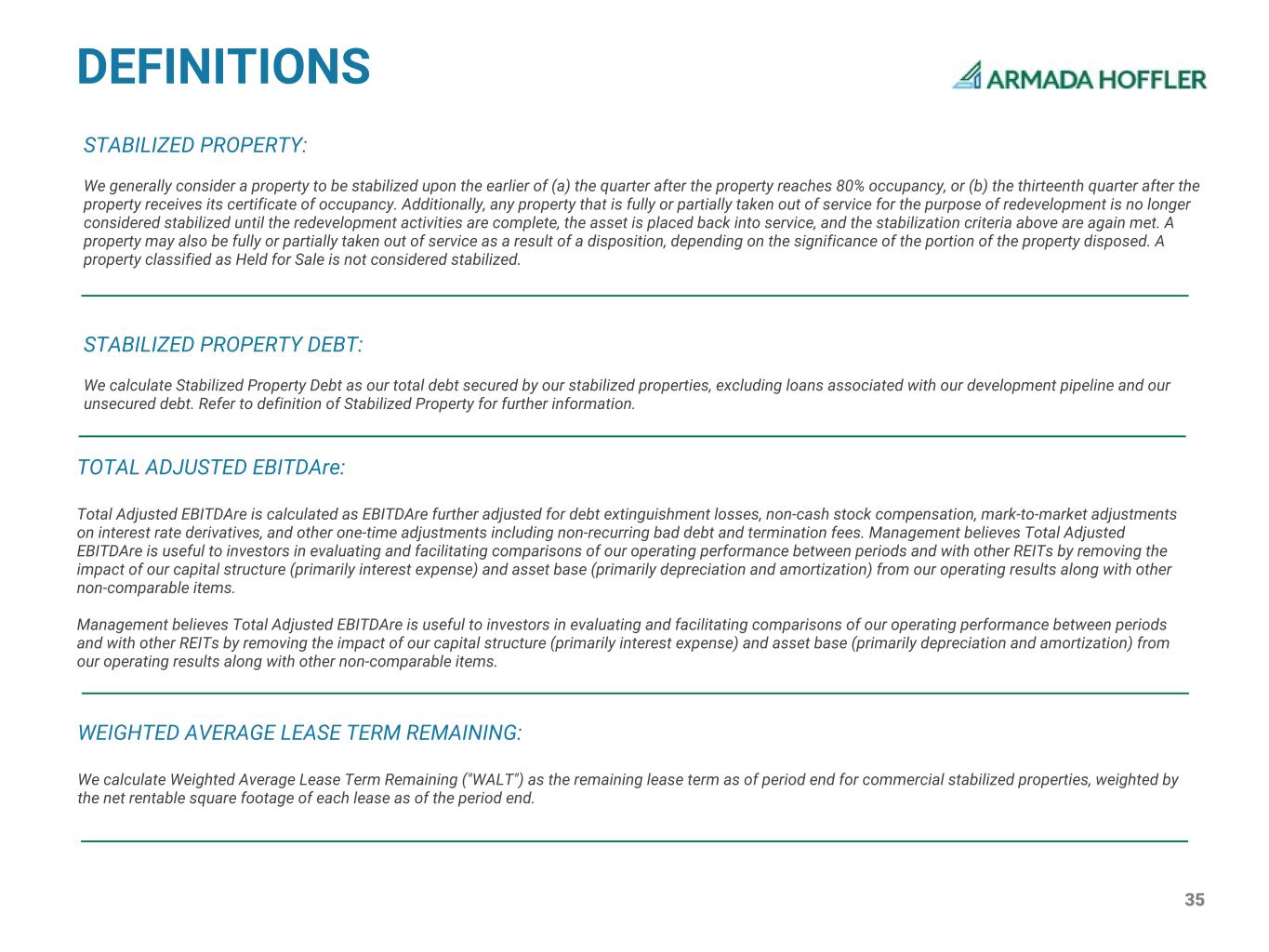 35定义稳定物业:我们一般认为物业在(a)物业达到80%入住率后的季度,或(b)物业收到其入住证后的第十三个季度中较早者稳定。此外,任何为重建目的而全部或部分停止服务的物业,在重建活动完成、资产重新投入服务并再次满足上述稳定标准之前,不再被视为稳定。财产也可能因处置而全部或部分停止使用,这取决于处置的财产部分的重要性。分类为持有待售的物业不被视为稳定。稳定财产债务:我们将稳定财产债务计算为我们由稳定财产担保的总债务,不包括与我们的开发管道相关的贷款和我们的无担保债务。更多信息参考稳定财产的定义。调整后EBITDA总额:调整后EBITDA总额计算为EBITDA进一步调整债务清偿损失、非现金股票补偿、利率衍生品按市值调整以及包括非经常性坏账和终止费在内的其他一次性调整。管理层认为,通过将我们的资本结构(主要是利息支出)和资产基础(主要是折旧和摊销)的影响与其他不可比项目一起从我们的经营业绩中剔除,总调整后EBITDA有助于投资者评估和促进我们在不同时期的经营业绩以及与其他REITs的比较。管理层认为,通过将我们的资本结构(主要是利息支出)和资产基础(主要是折旧和摊销)的影响与其他不可比项目一起从我们的经营业绩中剔除,调整后EBITDA总额有助于投资者评估和促进我们在不同时期的经营业绩以及与其他REITs的比较。加权平均租赁期限剩余:我们将加权平均租赁期限剩余(“WALT”)计算为截至期末商业稳定物业的剩余租赁期限,按截至期末每项租赁的净可出租面积加权。