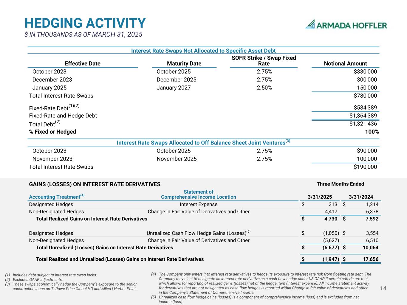 14(1)包括受利率互换锁定的债务。(2)不包括GAAP调整。(3)这些掉期在经济上对冲了公司对T. Rowe Price Global HQ和Allied | Harbor Point的高级建筑贷款的敞口。利率衍生品的套期活动收益(损失)三个月期末会计处理(4)综合收益表地点3/31/20253/31/2024指定套期利息支出$ 313 $ 1,214非指定套期衍生工具公允价值变动及其他4,4176,378利率衍生品已实现收益总额$ 4,730 $ 7,592指定套期未实现现金流量套期收益(损失)(5)$(1,050)$ 3,554非指定套期工具公允价值变动及其他(5,627)6,510利率衍生品未实现(损失)收益总额$(6,677)$ 10,064已实现总额利率衍生品的未实现(损失)收益$(1,947)$ 17,656未分配给特定资产债务的利率掉期生效日期到期日SOFR行使价/掉期固定利率名义金额2023年10月2025年10月2.75% $ 330,0002023年12月2025年12月2.75% 300,0002025年1月2027年1月2.50% 150,000总利率掉期$ 780,000固定利率债务(1)(2)$ 584,389固定利率和对冲债务1,364,389美元总债务(2)1,321,436%固定或对冲100%利率掉期分配给表外合资企业(3)2023年10月2025年10月2.75% 90,000美元2023年11月2025年11月2.75% 100,000美元总利率掉期190,000美元截至2025年3月31日(4)公司仅进行利率衍生工具以对冲浮动利率债务的利率风险敞口。如果满足某些标准,公司可能会选择指定利率衍生工具作为美国公认会计原则下的现金流量套期保值,这允许报告扣除套期保值项目(利息费用)后的已实现收益(损失)。所有未指定为现金流量套期的衍生工具的损益表活动均在公司综合收益表的衍生工具公允价值变动及其他项下列报。(5)未实现现金流量套期收益(损失)是综合收益(损失)的组成部分,不计入净收益(损失)。