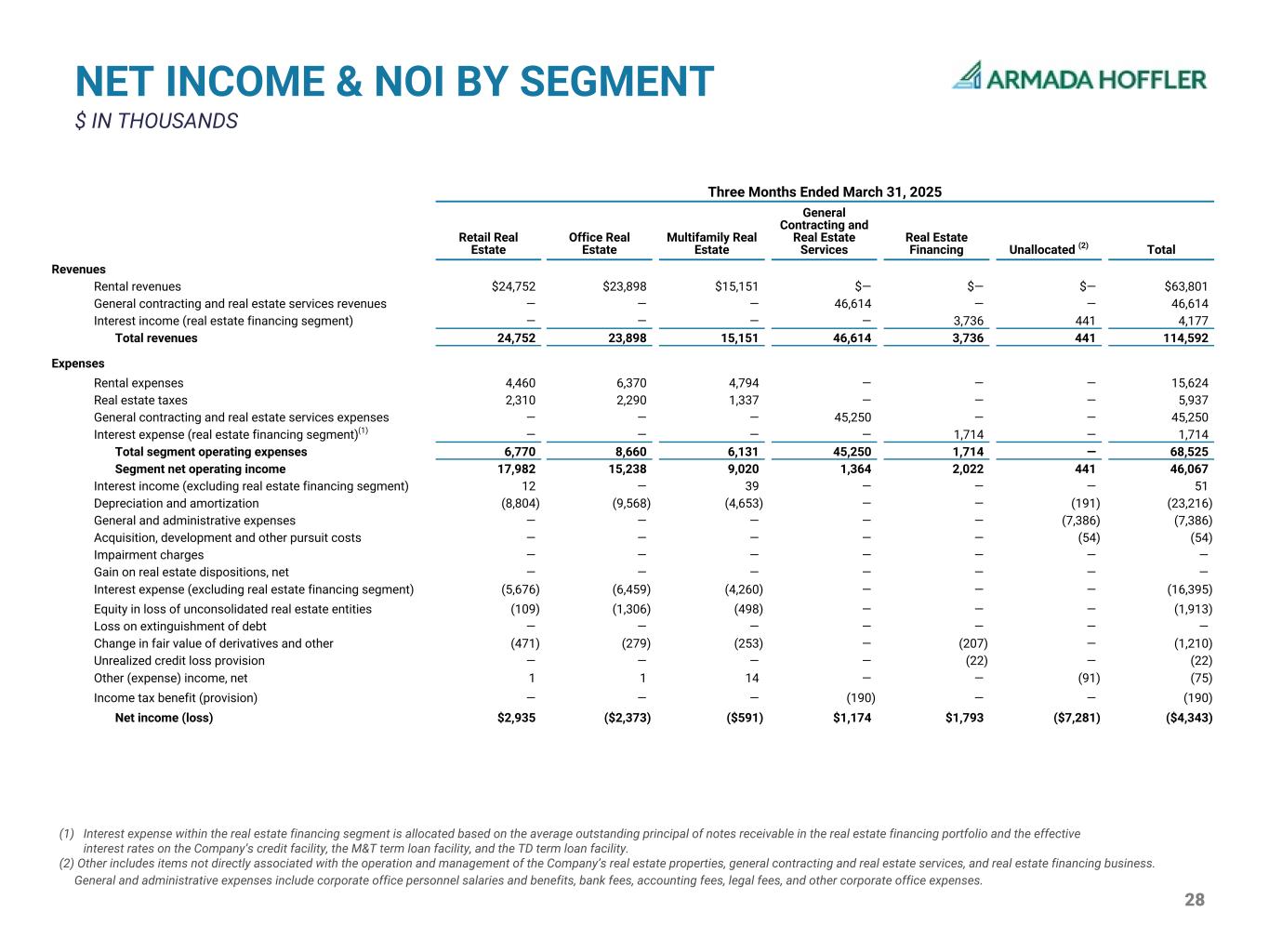 28截至3月31日的三个月按部门划分的净收入和NOI以千美元计,2025年零售房地产办公室房地产多户房地产总承包和房地产服务房地产融资未分配(2)总收入租金收入$ 24,752 $ 23,898 $ 15,151 $ — $ — $ — $ 63,801总承包和房地产服务收入———— 46,614 —— 46,614利息收入(房地产融资部分)———— 3,7364414,177总收入24,75223,89815,15146,6143,736441114,592费用租金支出4,4606,3704,794 ———— 15,624房地产税2,3102,2901,337 ———— 5,937总承包及房地产服务费用———— 45,250 —— 45,250利息费用(房地产融资分部)(1)———— 1,714 — 1,714分部营业费用合计6,7708,6606,13145,2501,714 — 68,525分部营业净收入17,98215,2389,0201,3642,02244146,067利息收入(不含房地产融资分部)12 — 39 ———— 51折旧和摊销(8,804)(9,568)(4,653)——(191)(23,216)一般及管理费用————(7,386)(7,386)收购,开发及其他追求成本——————(54)(54)减值费用————————不动产处置收益,净额————————利息支出(不含房地产融资分部)(5,676)(6,459)(4,260)————(16,395)未合并房地产实体损失中的权益(109)(1,306)(498)————(1,913)债务清偿损失——————衍生工具及其他公允价值变动(471)(279)(253)——(207)——(1,210)未实现信用损失准备————(22)——(22)其他(费用)收入,净额1114 ——(91)(75)所得税优惠(拨备)————(190)——(190)净收入(亏损)2935美元(2373美元)(591美元)1174美元1793美元(7281美元)(4343美元)(1)房地产融资分部内的利息支出根据房地产融资组合中应收票据的平均未偿本金以及公司信贷融资、M & T定期贷款融资和TD定期贷款融资的实际利率进行分配。(二)其他包括与公司不动产经营管理、总承包及不动产服务、不动产融资业务不直接关联的项目。一般及行政开支包括公司办公室人员薪金及福利、银行费用、会计费、律师费及其他公司办公开支。