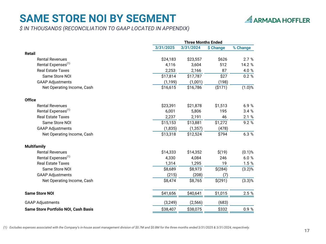 17(1)不包括与公司内部资产管理部门相关的开支,截至2025年3月31日和2024年3月31日止三个月分别为70万美元和80万美元。同一店铺按分部划分的NOI以千美元计(与附录中所载GAAP的对账)截至3/31/20253/31/2024的三个月$变动%变化零售租金收入$ 24,183 $ 23,557 $ 6262.7%租金支出(1)4,1163,60451214.2%房地产税2,2532,166874.0%同店NOI $ 17,814 $ 17,787 $ 270.2% GAAP调整(1,199)(1,001)(198)净营业收入,现金$ 16,615 $ 16,786($ 171)(1.0)%办公室租金收入$ 23,391 $ 21,878 $ 1,5136.9%租金支出(1)6,0015,8061953.4%房地产税2,2372,191462.1%同店NOI $ 15,153 $ 13,881 $ 1,2729.2% GAAP调整(1,835)(1,357)(478)净营业收入,现金$ 13,318 $ 12,524 $ 7946.3%多户家庭租金收入$ 14,333 $ 14,352 $(19)(0.1)%租金支出(1)4,3304,0842466.0%房地产税1,3141,295191.5%同店NOI $ 8,689 $ 8,973 $(284)(3.2)% GAAP调整(现金$ 8,474 $ 8,765 $(291)(3.3)%同店NOI $ 41,656 $ 40,641 $ 1,0152.5% GAAP调整(3,249)(2,566)0(683)同店组合NOI,现金基础$ 38,407 $ 38,075 $ 33 20.9%