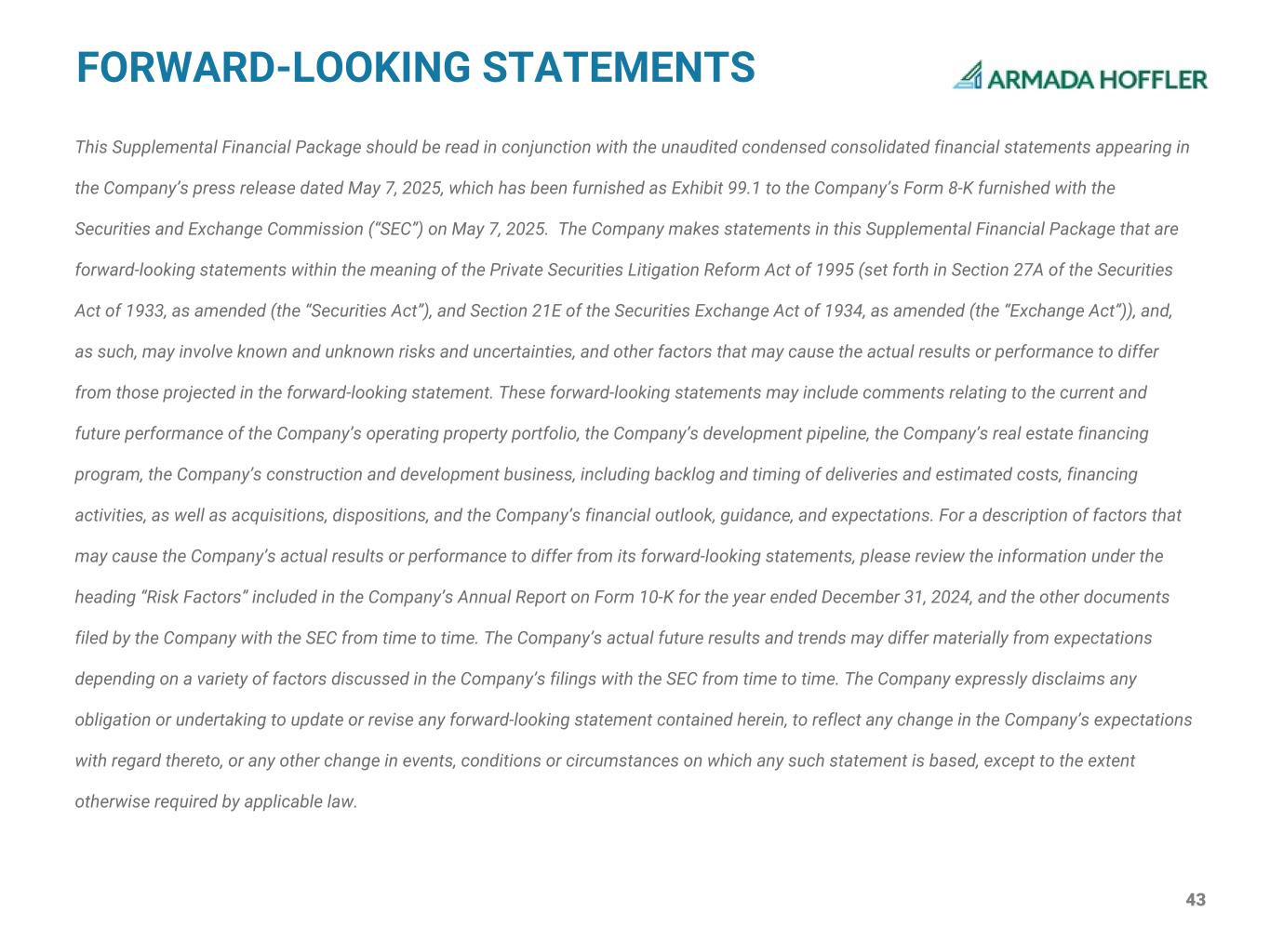 43本补充财务包应与公司日期为2025年5月7日的新闻稿中出现的未经审计的简明综合财务报表一起阅读,该新闻稿已作为公司于2025年5月7日向美国证券交易委员会(“SEC”)提供的8-K表格的附件 99.1。公司在本补充财务包中作出的陈述属于1995年《私人证券诉讼改革法案》(载于经修订的1933年《证券法》(“证券法”)第27A条和经修订的1934年《证券交易法》(“交易法”)第21E条)含义内的前瞻性陈述,因此可能涉及已知和未知的风险和不确定性,以及可能导致实际结果或业绩与前瞻性陈述中预测的不同的其他因素。这些前瞻性陈述可能包括与公司运营物业组合的当前和未来业绩、公司的开发管道、公司的房地产融资计划、公司的建设和开发业务相关的评论,包括交付和估计成本的积压和时间、融资活动,以及收购、处置,以及公司的财务前景、指导和预期。有关可能导致公司实际业绩或业绩与其前瞻性陈述不同的因素的描述,请查阅公司截至2024年12月31日止年度的10-K表格年度报告中“风险因素”标题下的信息,以及公司不时向SEC提交的其他文件。公司未来的实际业绩和趋势可能与预期存在重大差异,这取决于公司不时向SEC提交的文件中讨论的各种因素。公司明确表示不承担任何义务或承诺更新或修改此处包含的任何前瞻性陈述,以反映公司对此预期的任何变化,或任何此类陈述所依据的事件、条件或情况的任何其他变化,除非适用法律另有要求。前瞻性陈述