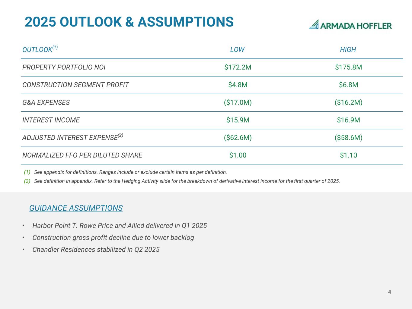 4(1)定义见附录。范围根据定义包括或排除某些项目。(2)见附录中的定义。2025年第一季度衍生利息收入细目详见套期保值活动幻灯片。2025年展望&假设展望(1)低的高物业投资组合NOI 1.722亿美元1.758亿美元的建筑部门利润480万美元680万美元的G & A费用(1700万美元)(1620万美元)利息收入1590万美元1690万美元调整后利息费用(2)(6260万美元)(5860万美元)正常化的每股稀释股份FFO 1.00美元1.10美元的指导假设• Harbor Point T. Rowe价格和Allied于2025年第一季度交付•由于积压较少,建筑毛利下降•