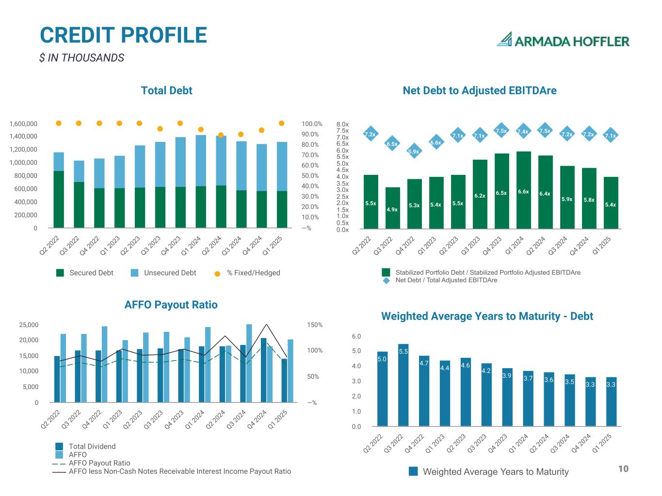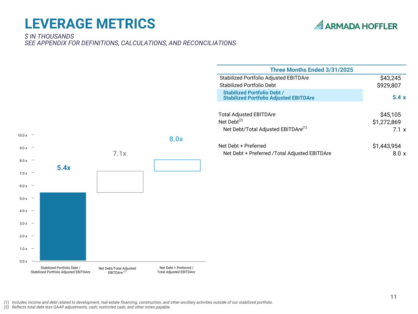39美元单位:千美元的债务和EBITDA对账(1)不包括归属于未合并房地产实体的利息费用、折旧和摊销部分。(2)不包括GAAP调整。截至2025年3月31日止三个月12/31/20249/30/20246/30/2024物业净营业收入$ 42,240 $ 41,574 $ 45,762 $ 42,292物业杂项费用,净额(266)(146)(35)(64)非经常性坏账调整2,166488296(478)非经常性终止费调整(153)(96)(4,277)(103)使用权资产摊销(395)(395)(395)(394)无形资产加速摊销和负债(169)——(5)——未合并房地产实体NOI中的权益(2)1,070718 ——物业调整后EBITDA为44,493美元42,143美元41,346美元41,253美元处置——(1,260)——开发/再开发(1,248)(990)(189)(51)稳定投资组合调整后EBITDA为43,245美元39,893美元41,157美元41,202美元建筑毛利1,3642,0933,3664,339公司G & A(7,153)(4,494)(5,008)(4,328)非现金股票补偿3,4641,2417 10744利息收入4,1764,5694,6364,580其他收入(费用),Net 921720 Total Adjusted EBITDA $ 45,105 $ 43,304 $ 44,878 $ 46,557 Stabilized Property Debt 510,389512,266530,513602,587 Add:Unsecured Property Debt 419,418403,417440,691459,973 Stabilized Portfolio Debt $ 929,807 $ 915,683 $ 971,204 $ 1,062,560 Stabilized Portfolio Debt/Stabilized Portfolio Adjusted EBITDA are 5.4x 5.7x 5.9x 6.4x Total Debt(2)1,321,4361,297,5101,330,1241,422,473